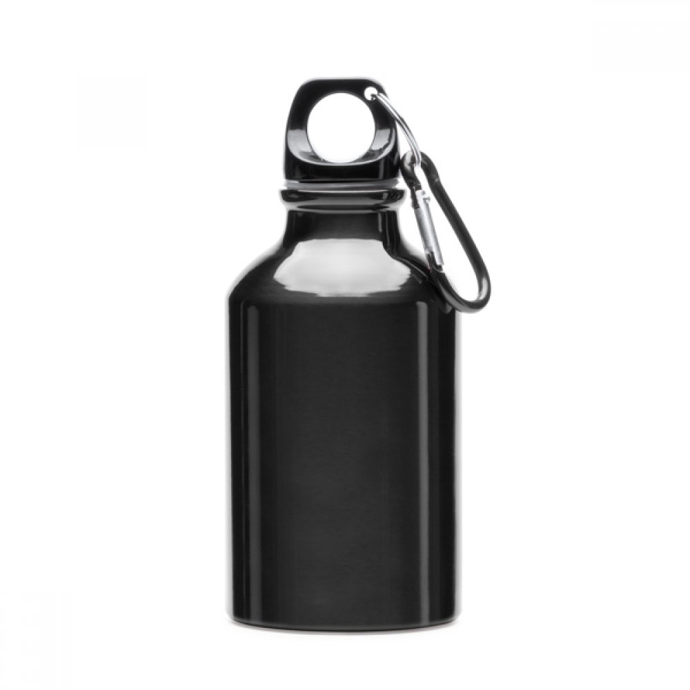 Алюминиевая бутылка с карабином. Черная крышка и карабин того же цвета металлик, что и бутылка. Емкость 330 мл. Поставляется в дизайнерской упаковке.