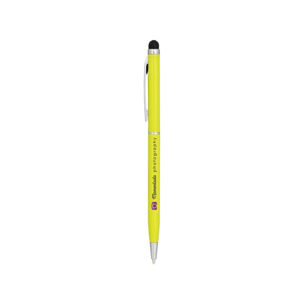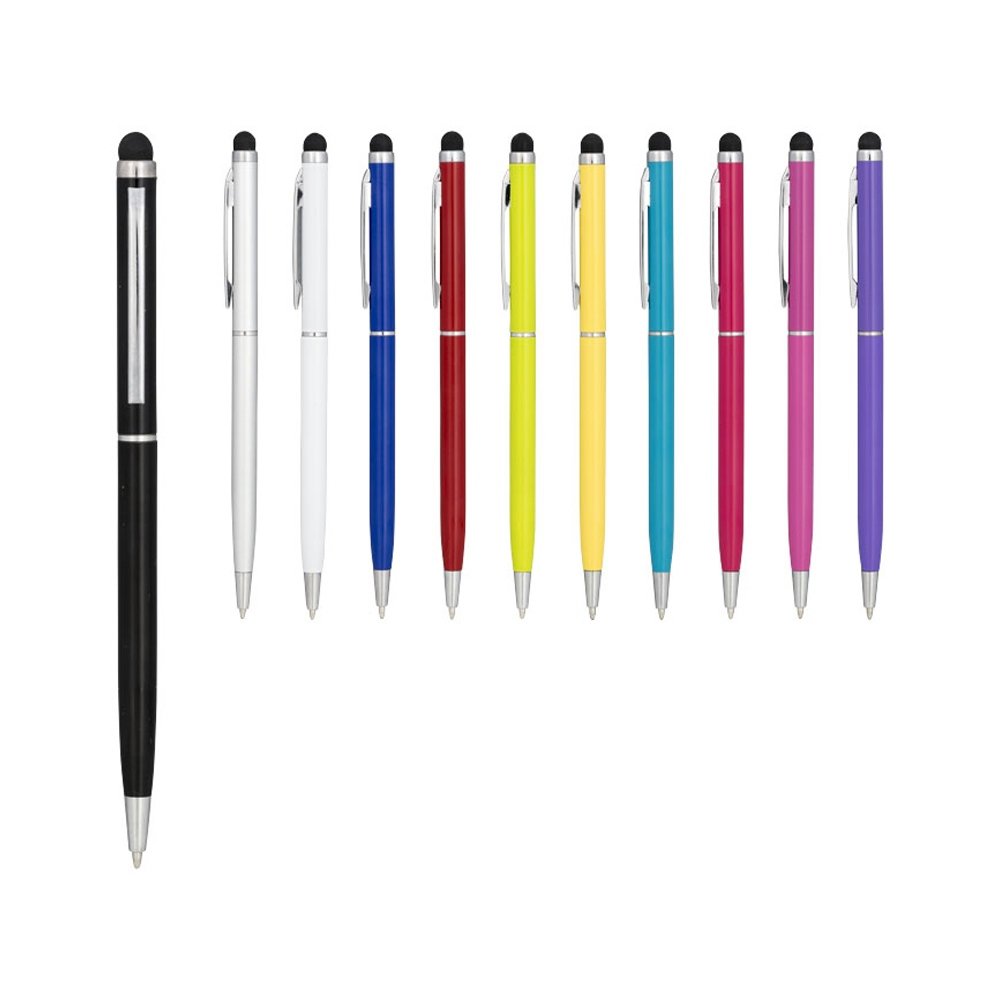 Алюминиевая шариковая ручка Joyce. Тонкая алюминиевая шариковая ручка с поворотным механизмом и стилусом. Алюминиевый корпус с металлическим зажимом и кольцом посередине, остальные элементы из пластика.