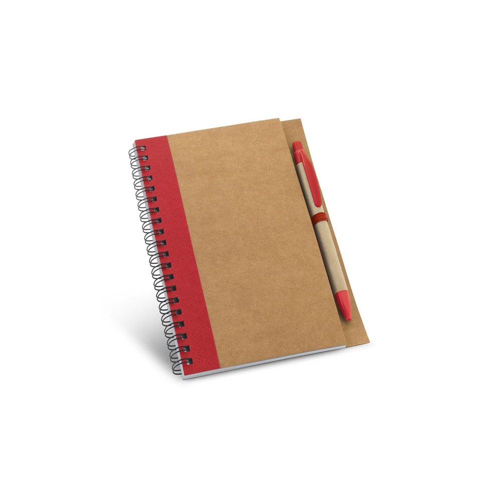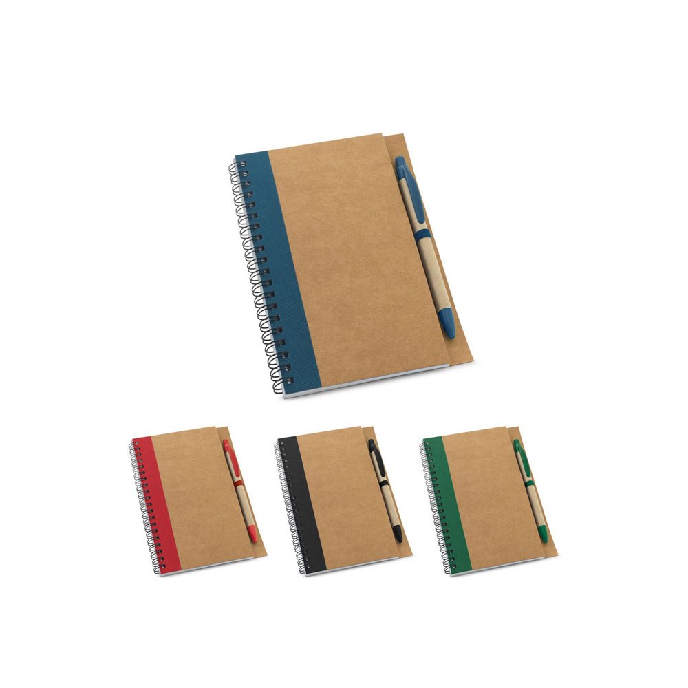 - Блокнот формата B6 со спиралью с 120 страницами без линовки из вторично переработанной бумаги и твердой обложкой из крафт-бумаги. Данный набор имеет держатель для ручки и в набор входит ручка.