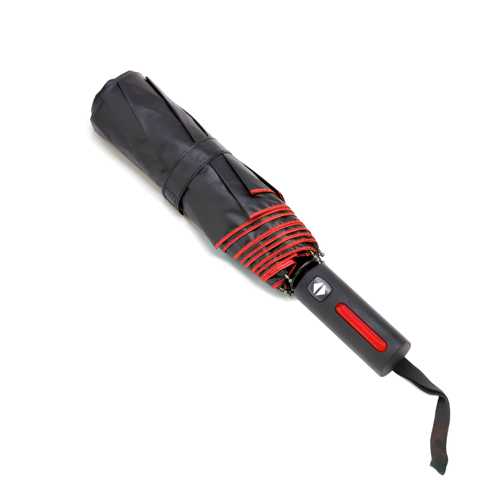 - Автоматический противоштормовой складной зонт Sherp. Материал купола – эпонж. На таком материале вода превращается в капельки и скатывается, а сам зонт остается сухим. Цветной элемент на ручке – в тон купола. Ветрозащитная функция – спицы из стекловолокна, а специальное устройство препятствует поломке спиц при резких порывах ветра.