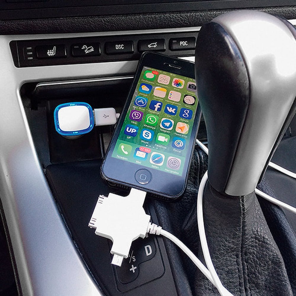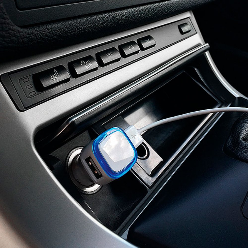 Автомобильный адаптер "Mobicar" для зарядки мобильных устройств с подсветкой и двумя USB-портами белый, синий арт. 7028