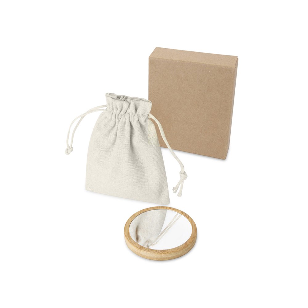 - Круглое зеркало из бамбука в хлопковом мешочке.