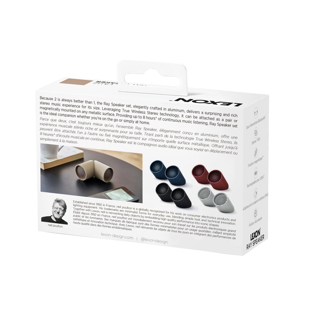 - Ray Speaker — это дуэт магнитных Bluetooth®-колонок, удостоенных наград Red Dot Design Award и IF Design Award. Обеспечивая захватывающий стереозвук благодаря технологии True Wireless Stereo, эти колонки легко крепятся друг к другу или к любой магнитной поверхности, что делает их идеальными для использования дома или в дороге. Помимо прослушивания музыки, Ray Speaker позволяет совершать звонки без помощи рук и дистанционно делать селфи. Благодаря аккумулятору, работающему до 8 часов, и элегантному алюминиевому корпусу, они добавят современный штрих в ваш интерьер, а степень водонепроницаемости IPX4 позволяет использовать их на улице. Доступны различные цвета, которые дополнят ваш стиль. - Комплект магнитных динамиков Bluetooth® - Совместимость с TWS для стереозвучания - Микрофон без помощи рук - Управление селфи - Удобный для использования на открытом воздухе IPX4 - Срок службы батареи: до 8 ч - Время зарядки: 3 ч - Зарядка через кабель USB C в комплекте - Питание: USB-адаптер питания 5 В в комплект не входит