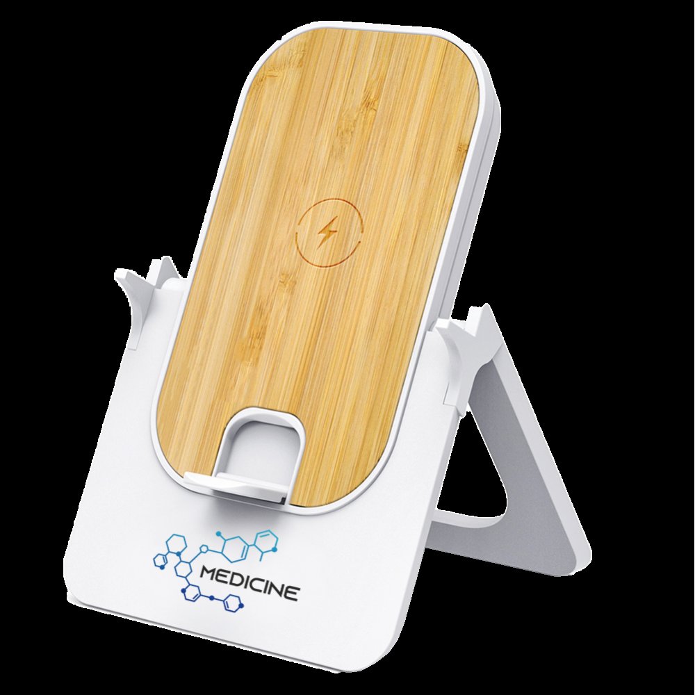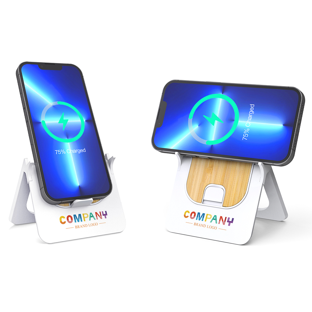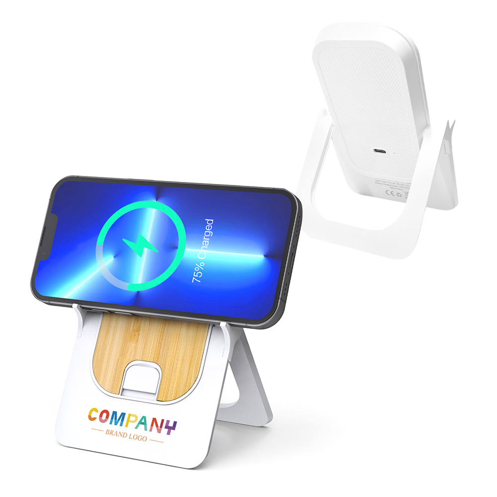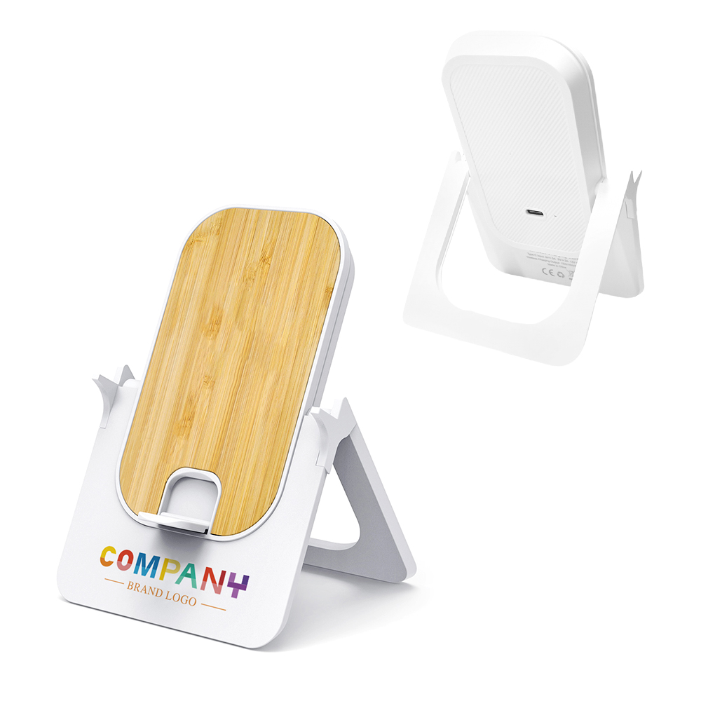 - 1. Foldable Wireless Charger 2. Hidden Phone Stand 3. Horizontal and vertical wireless charging 4. Wheat Straw Housing (Optional) Housing/Input/Output/Accessories 1. Housing: ABS & Bamboo 2. Standard color: White + Bamboo 3. Input: Type-C 4. Logo: No Logo, Do it yourself 5. User manual: Standard 6. Charging cable: 1m Type-C 7. Packaging: Kraft paper box 8. Product size: 123*87*38mm