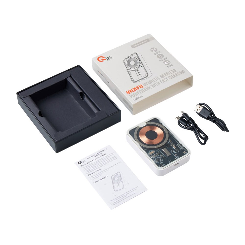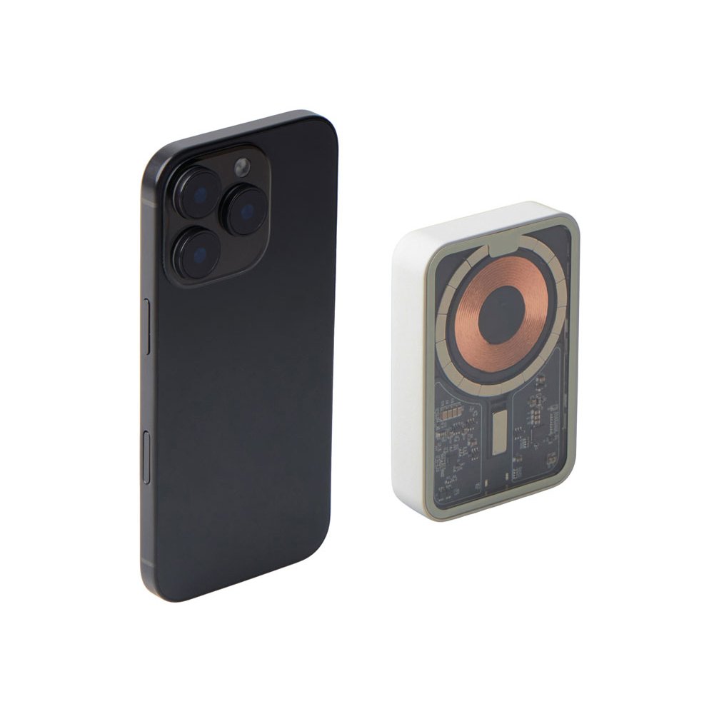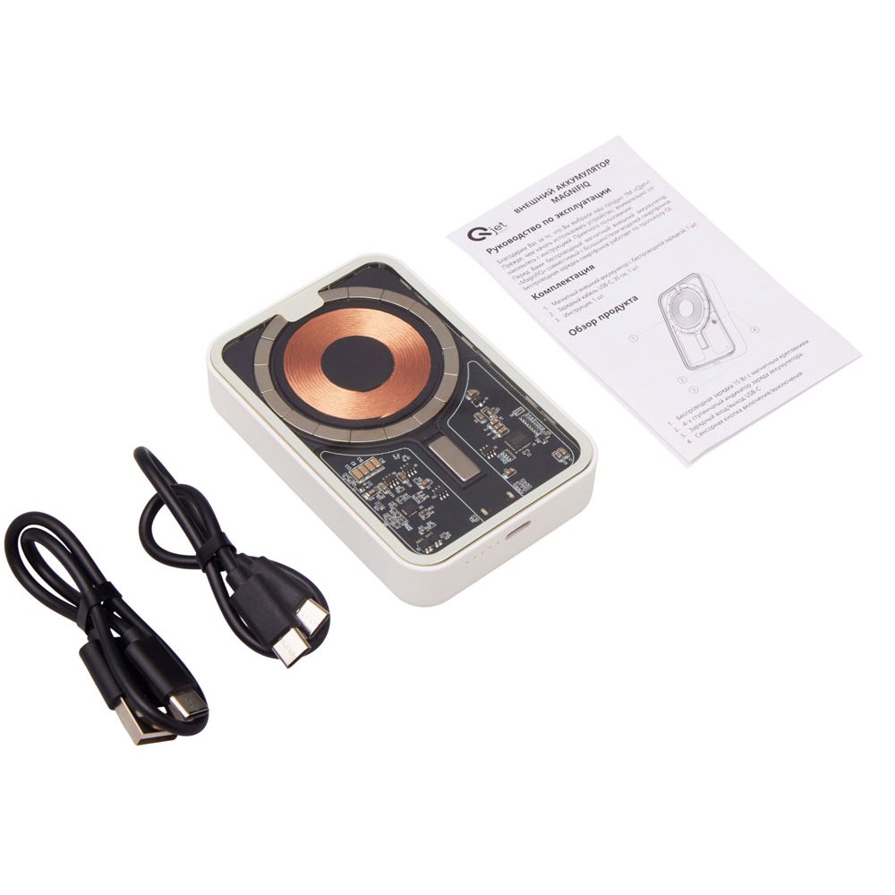 - Беспроводной магнитный внешний аккумулятор MagnifIQ — технологичный и стильный power bank с эффектной прозрачной передней панелью, сквозь которую видны мощные магниты, индукционная катушка и электронная начинка. Ёмкость 10 000 мА·ч обеспечивает до 2–3 полных зарядов смартфона, а поддержка быстрой беспроводной зарядки до 15 Вт (с совместимостью QC/PD) делает процесс зарядки максимально быстрым и удобным. Двунаправленный USB-C порт позволяет как заряжать другие устройства, так и сам аккумулятор. Обе стороны корпуса подходят для нанесения логотипа: лицевая — через прозрачную панель, задняя — на приятное на ощупь soft-touch покрытие. Компактный, надёжный и сильный — идеальный технологичный продукт для продвижения и ежедневного использования. Поставляется в качественной упаковке с шубером, Двунаправленный кабель USB-C и кабель USB-A – USB-C в комплекте. • Прозрачная передняя панель — демонстрирует внутреннюю «начинку» и подчеркивает технологичность бренда. • Магнитная беспроводная зарядка 15 Вт • Ёмкость 10 000 мА·ч — хватает на несколько полных зарядов смартфона. • Двунаправленный USB-C — универсальность для зарядки и подзарядки. • Две зоны нанесения логотипа: на прозрачную панель спереди и на soft-touch покрытие сзади. • Сильные магниты обеспечивают надёжную фиксацию на совместимых устройствах.