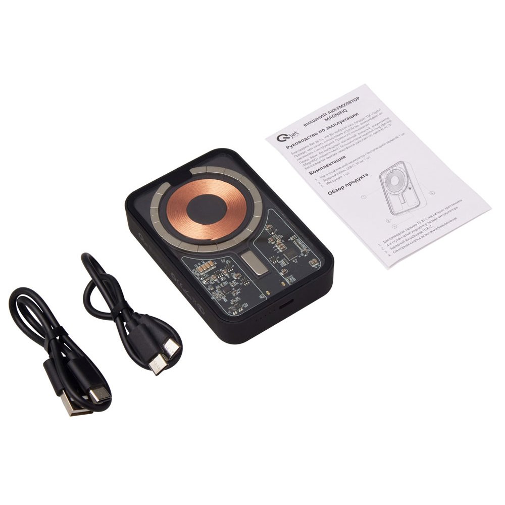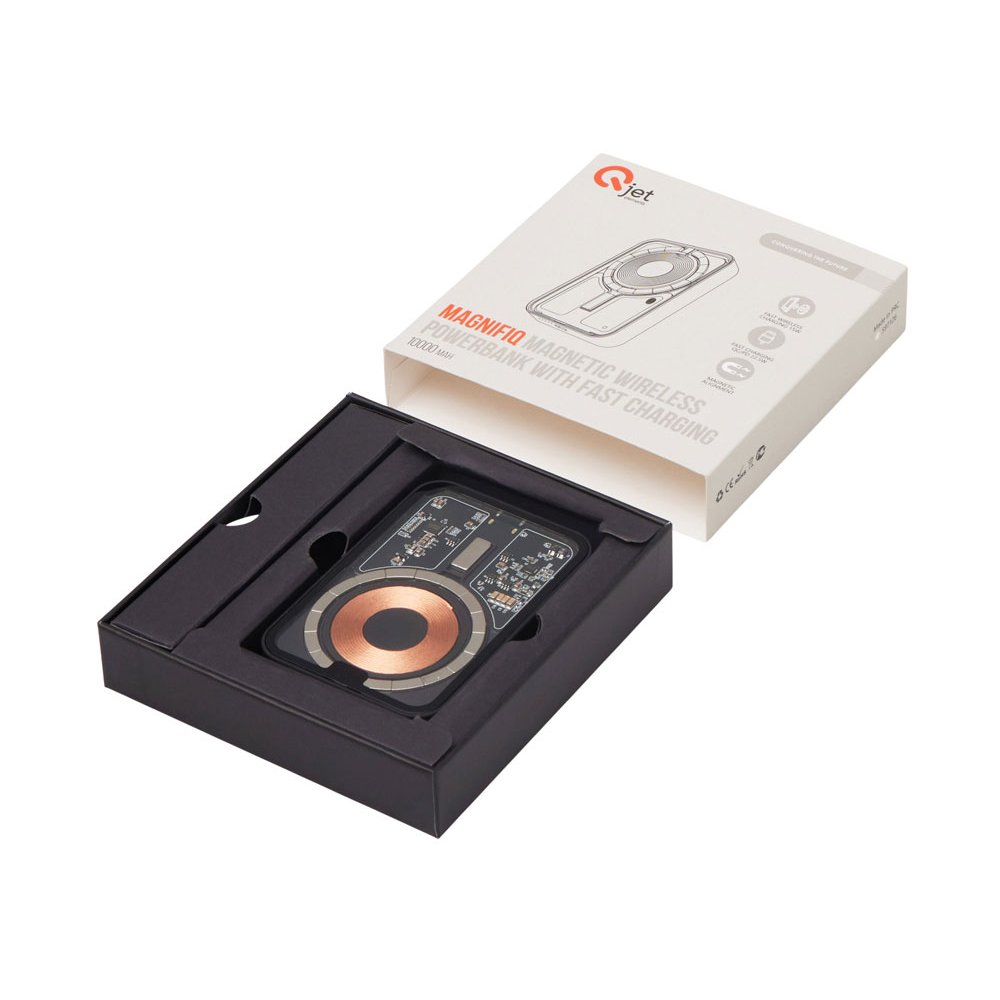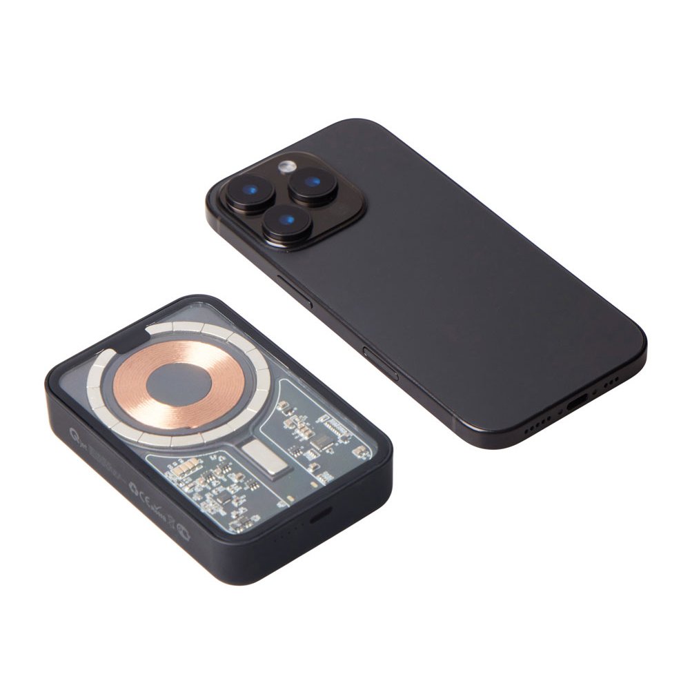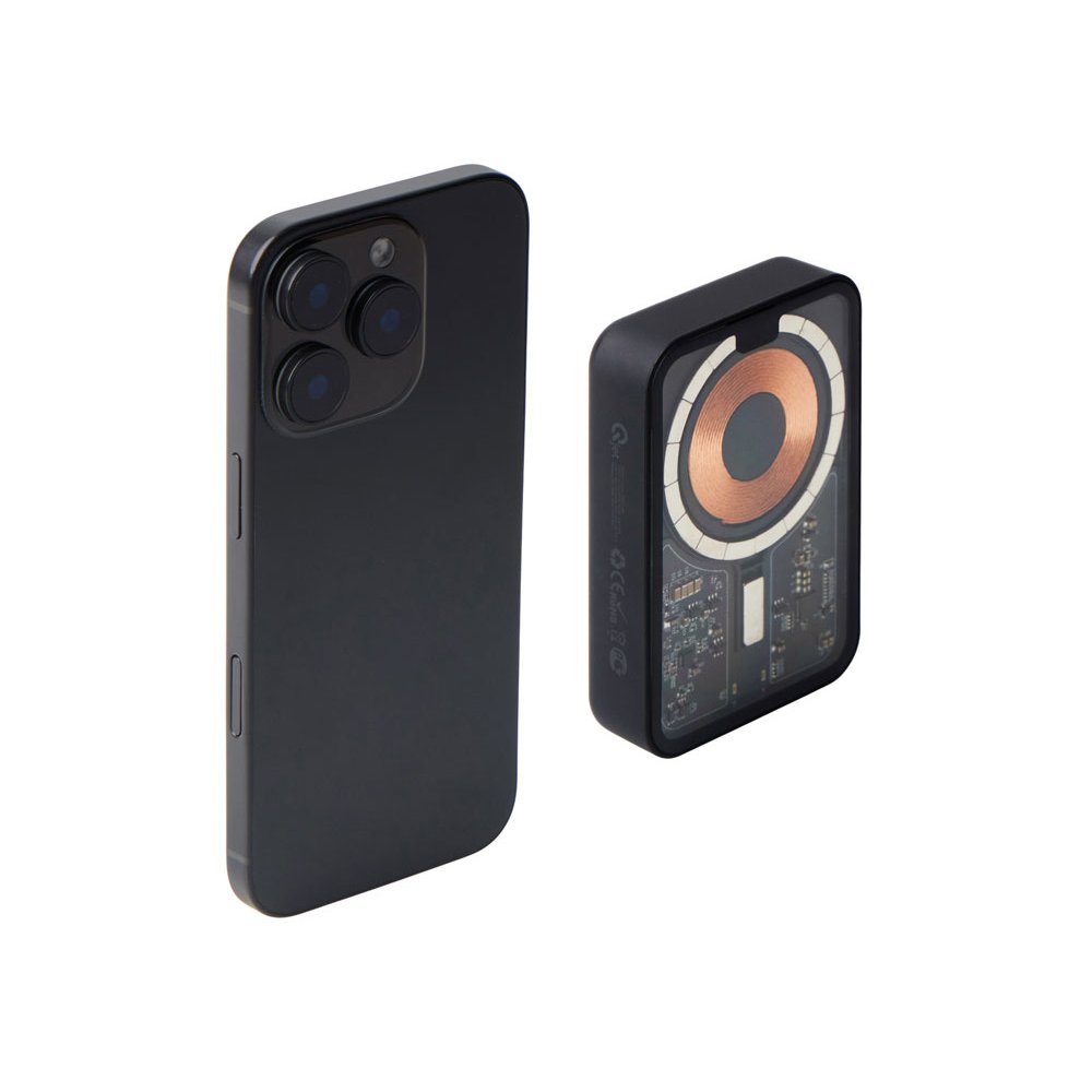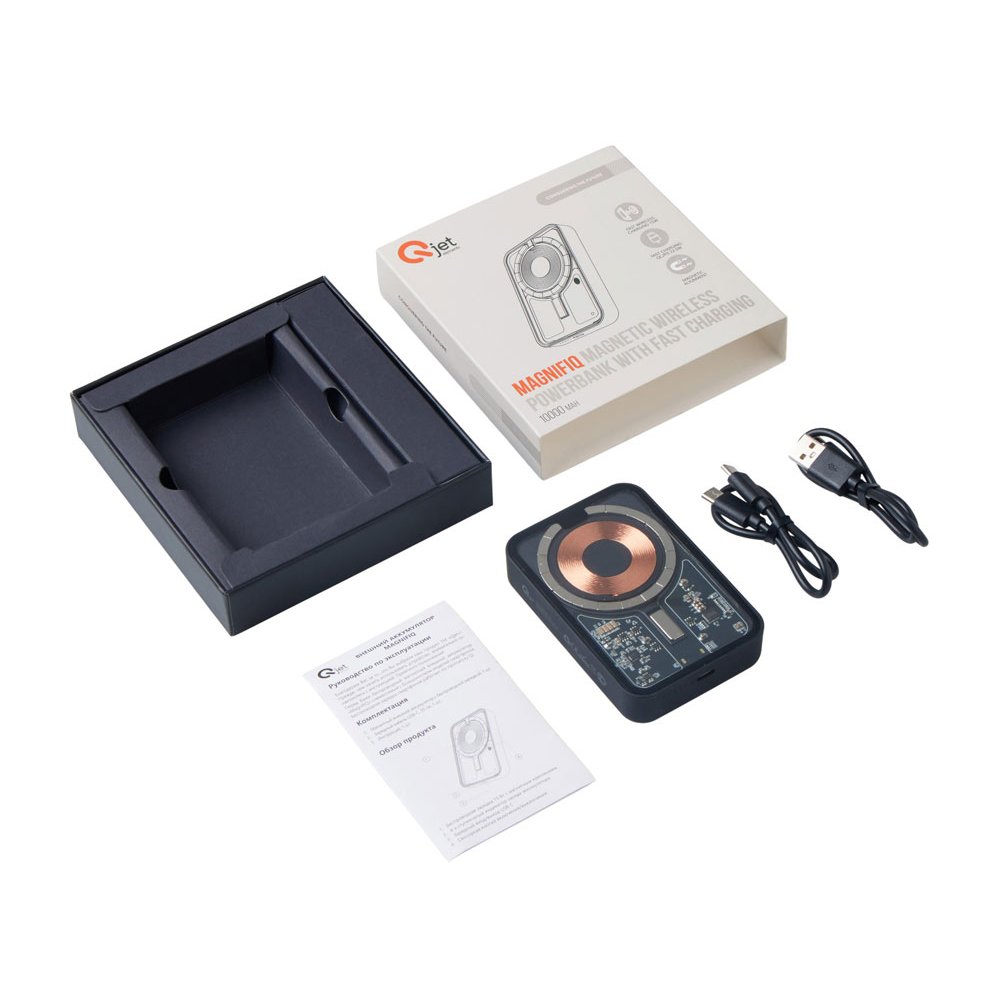 - Беспроводной магнитный внешний аккумулятор MagnifIQ — технологичный и стильный power bank с эффектной прозрачной передней панелью, сквозь которую видны мощные магниты, индукционная катушка и электронная начинка. Ёмкость 10 000 мА·ч обеспечивает до 2–3 полных зарядов смартфона, а поддержка быстрой беспроводной зарядки до 15 Вт (с совместимостью QC/PD) делает процесс зарядки максимально быстрым и удобным. Двунаправленный USB-C порт позволяет как заряжать другие устройства, так и сам аккумулятор. Обе стороны корпуса подходят для нанесения логотипа: лицевая — через прозрачную панель, задняя — на приятное на ощупь soft-touch покрытие. Компактный, надёжный и сильный — идеальный технологичный продукт для продвижения и ежедневного использования. Поставляется в качественной упаковке с шубером, Двунаправленный кабель USB-C и кабель USB-A – USB-C в комплекте. • Прозрачная передняя панель — демонстрирует внутреннюю «начинку» и подчеркивает технологичность бренда. • Магнитная беспроводная зарядка 15 Вт • Ёмкость 10 000 мА·ч — хватает на несколько полных зарядов смартфона. • Двунаправленный USB-C — универсальность для зарядки и подзарядки. • Две зоны нанесения логотипа: на прозрачную панель спереди и на soft-touch покрытие сзади. • Сильные магниты обеспечивают надёжную фиксацию на совместимых устройствах.