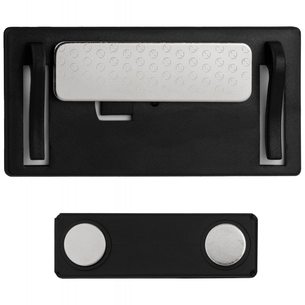 - Бейдж с окошком для офсетной вставки. Крепится с помощью магнита и не портит одежду. Также можно легко закрепить конструкцию на кармане пиджака или рубашки с помощью зажимов на задней поверхности.