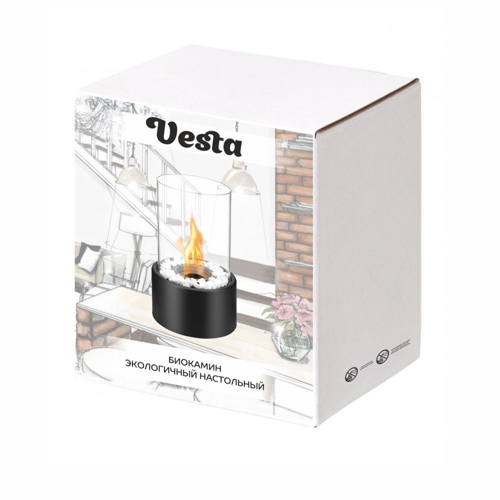 - Биокамин Vesta отличный способ создать волшебную и уютную атмосферу домашнего очага! В качестве топлива используется экологически безвредный этиловый спирт. Долгое горение и стеклянная защита позволяют наслаждаться видом пламени в течение 60-90 минут, а легкая и практичная конструкция позволяет захватить камин даже в поход или вечерний романтический пикник.