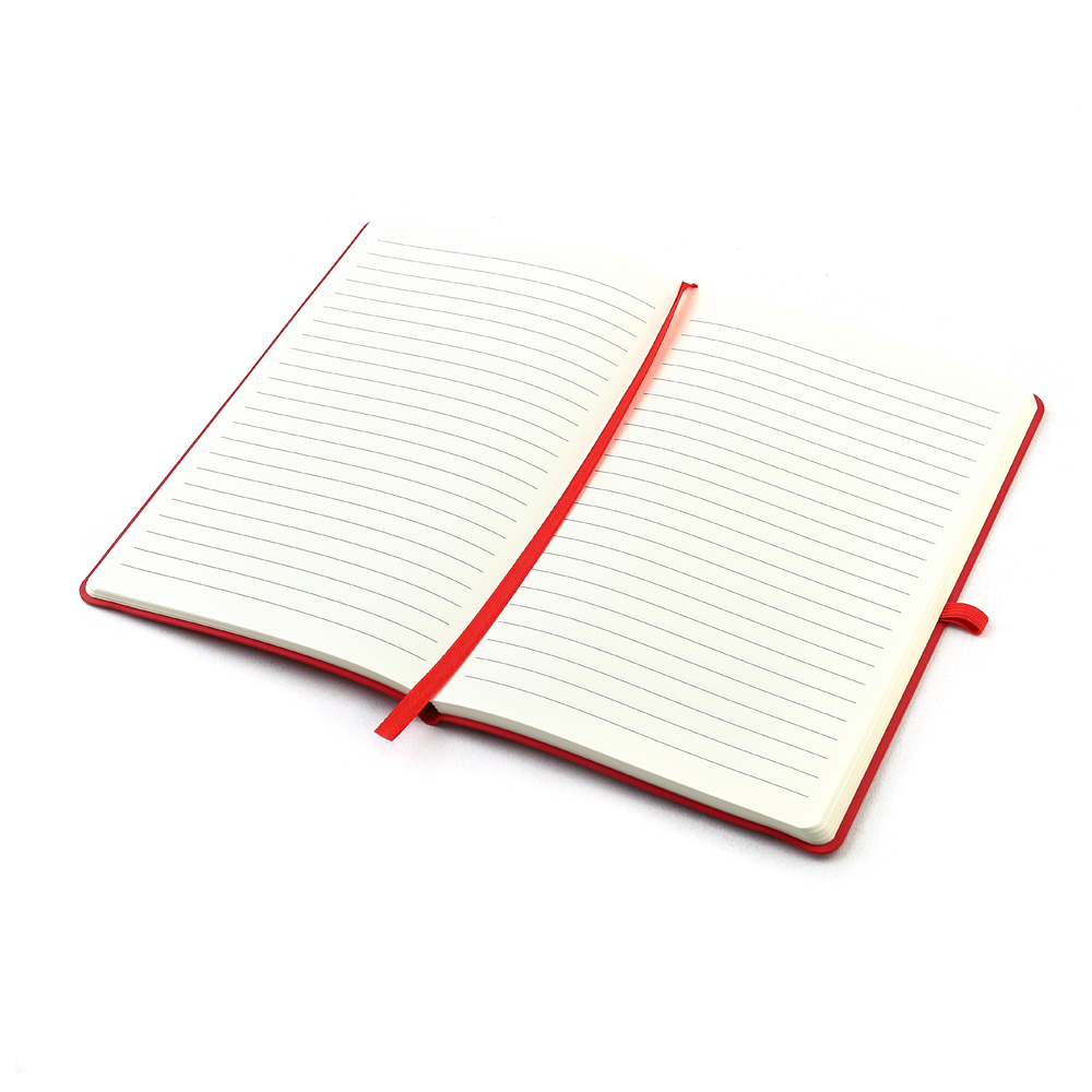 - Блокнот формата А5 с мягким покрытием из PU-материала с имитацией рисунка кожи, с эластичной застежкой и текстильной закладкой, наличие петли для ручки в цвет блокнота, 192 страницы, плотность 70г/м, страницы с черными линиями.
