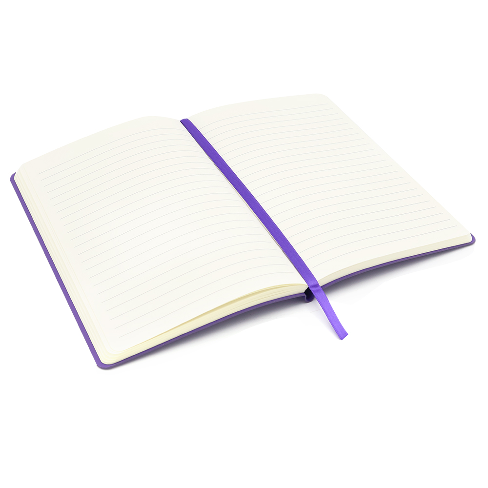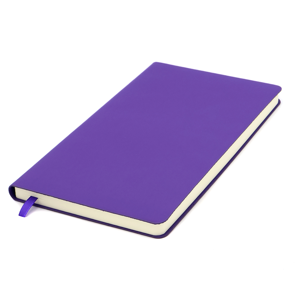- Блокнот формата А5 с мягкой обложкой из PU-материала, имеющего текстуру, имитирующую поверхность натуральной кожи; с текстильной закладкой в цвет блокнота, 256 страниц, плотность 70г/м, страницы с черными линиями. Цвет по PANTONE® (максимально приближен): 267 С