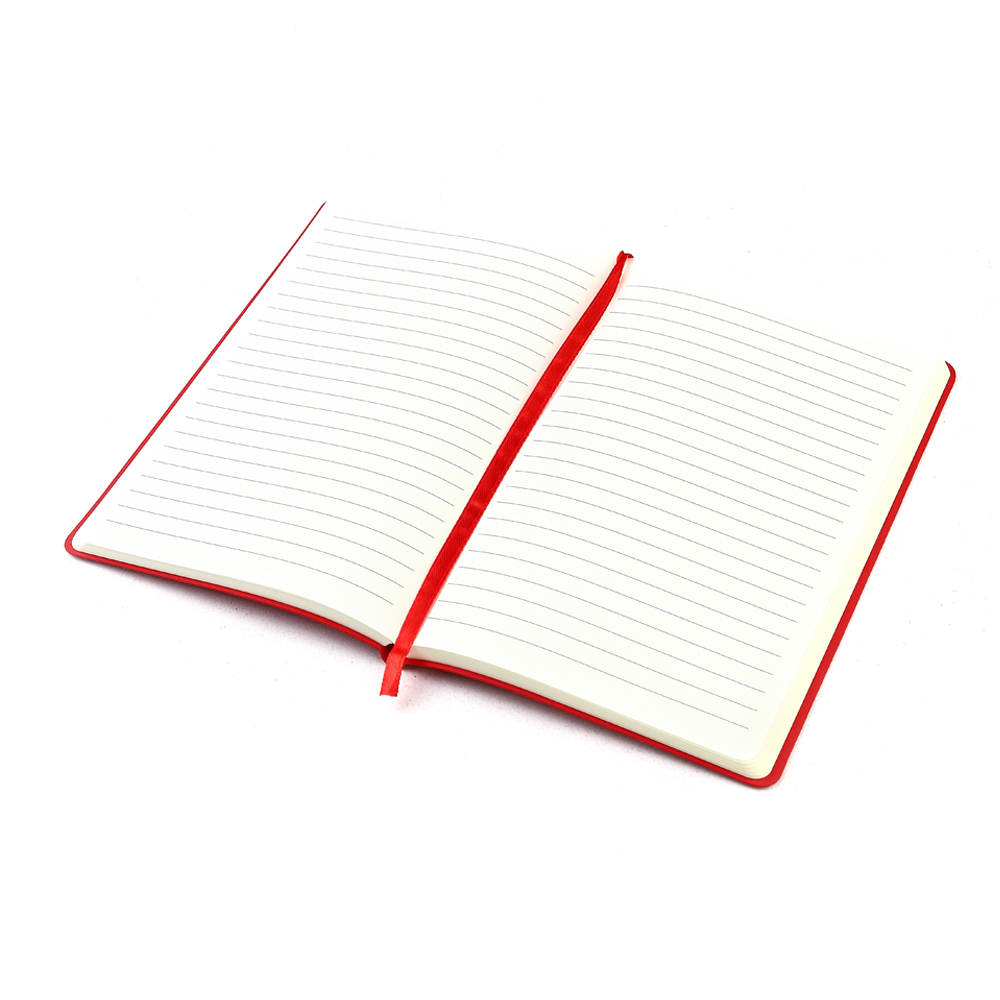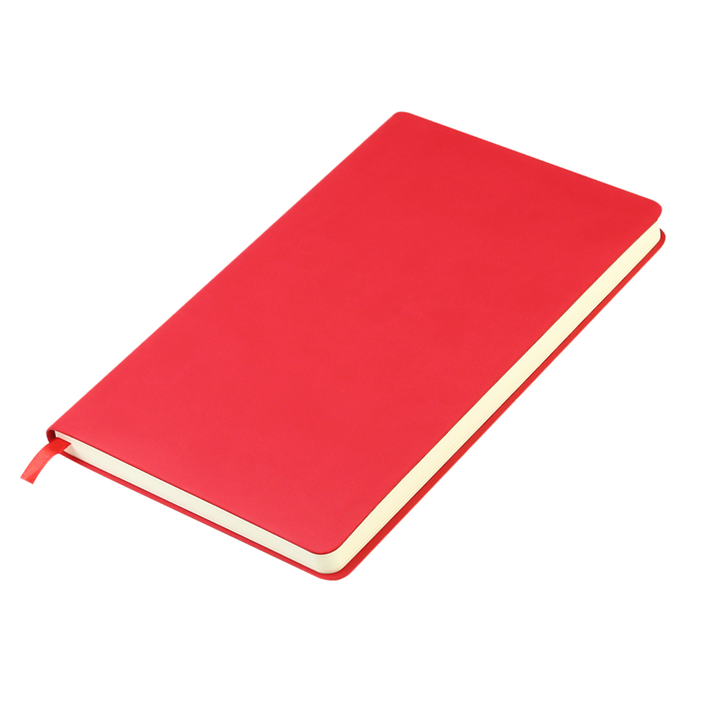 - Блокнот формата А5 с мягким покрытием из PU-материала с имитацией рисунка кожи, с текстильной закладкой в цвет блокнота, 256 страниц, плотность 70г/м, страницы с черными линиями.