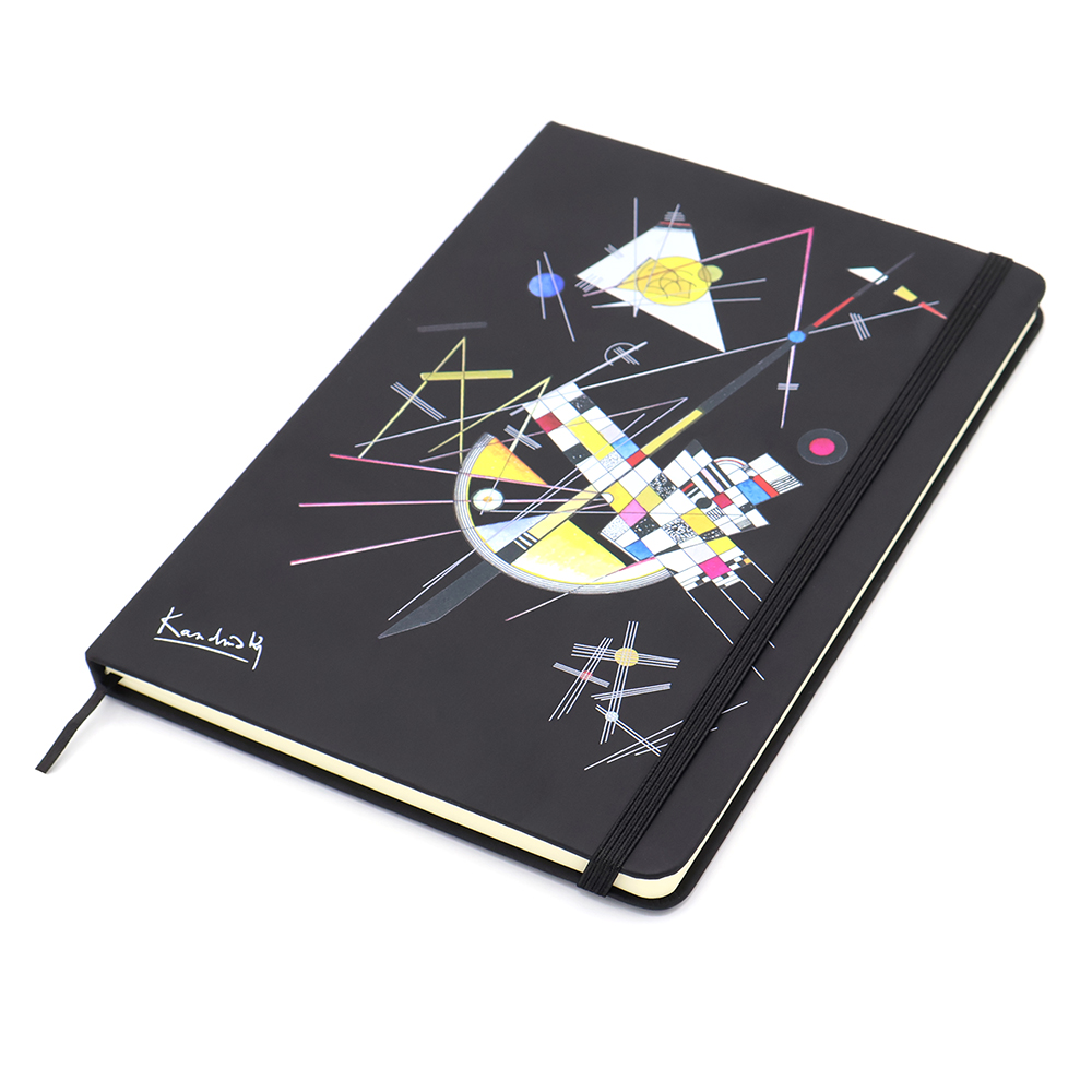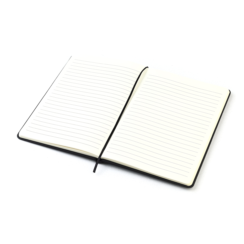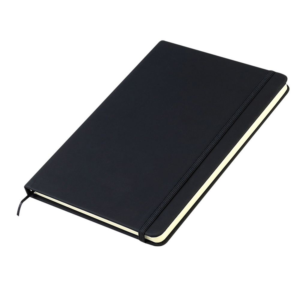 - Блокнот формата А5 с твердым покрытием из PU-материала с имитацией рисунка кожи, с эластичной застежкой для закрытия и текстильной закладкой в цвет блокнота, 192 страницы, плотность 70г/м, страницы с черными линиями.