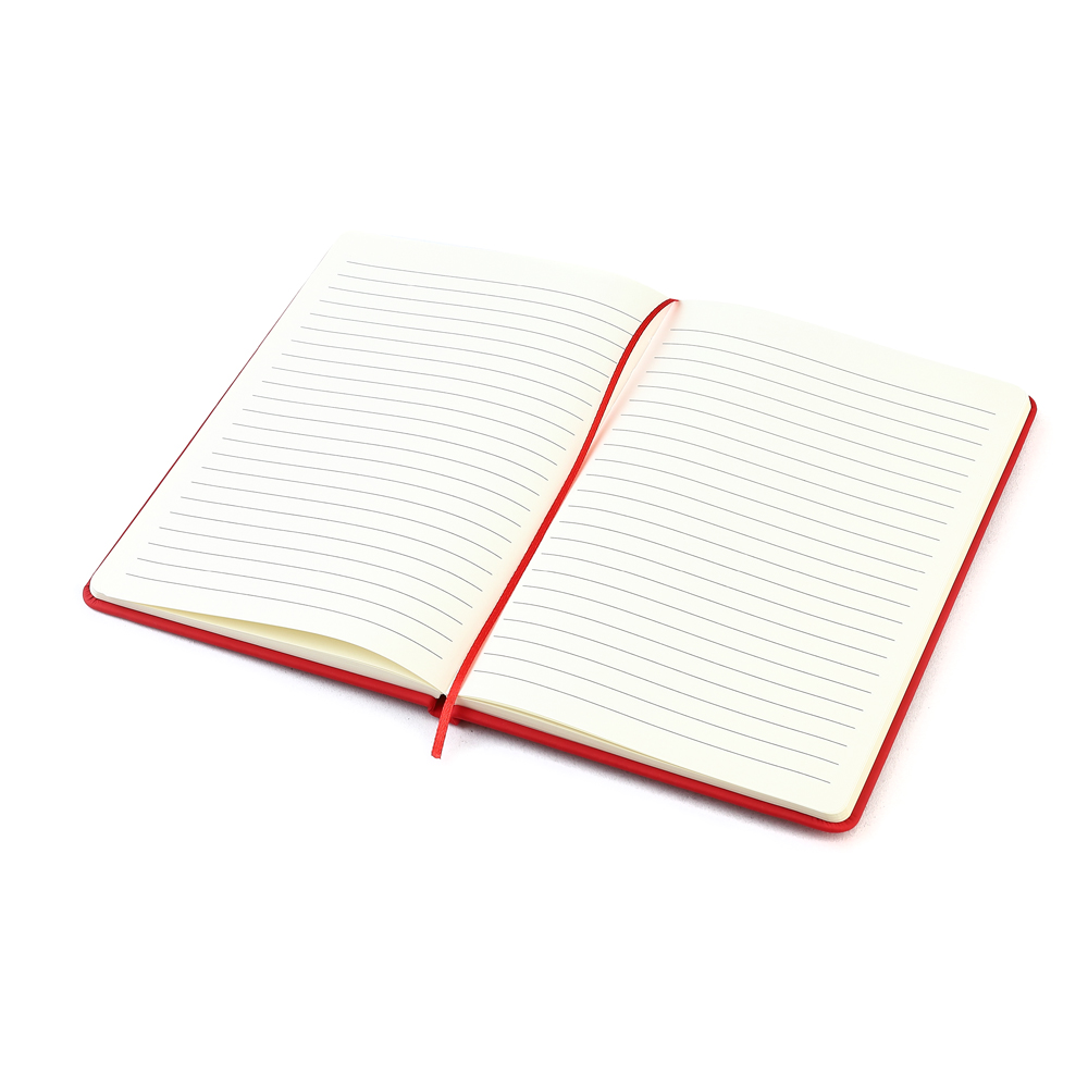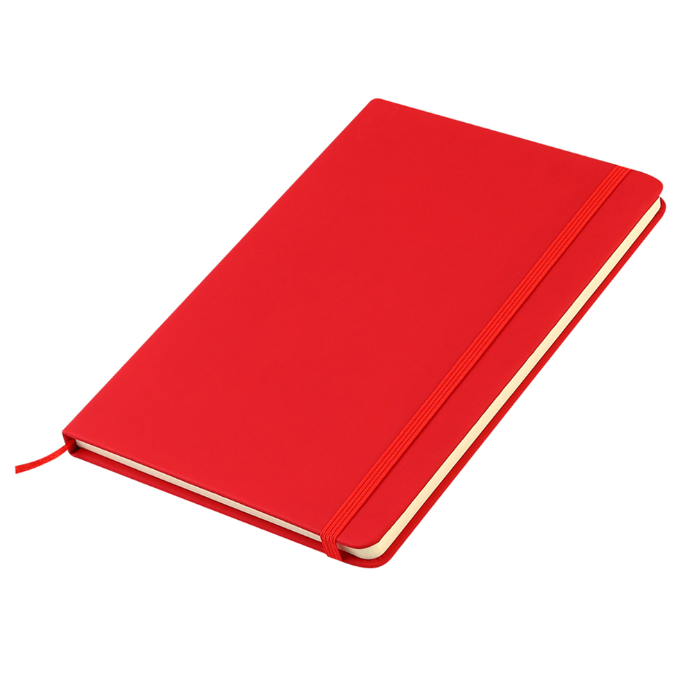 - Блокнот формата А5 с твердым покрытием из PU-материала с имитацией рисунка кожи, с эластичной застежкой для закрытия и текстильной закладкой в цвет блокнота, 192 страницы, плотность 70г/м, страницы с черными линиями.