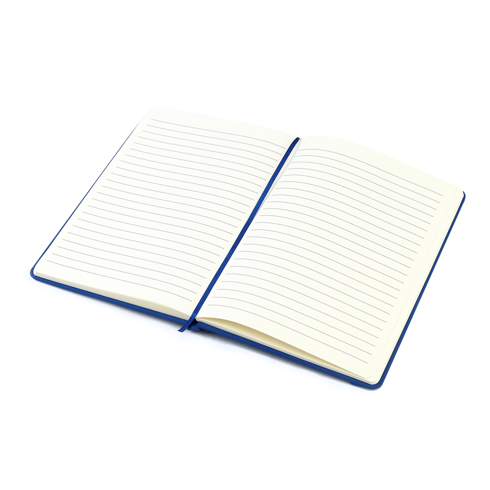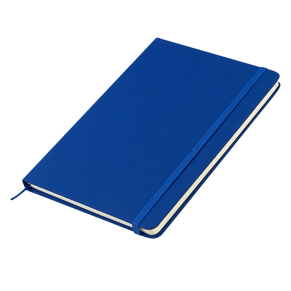 - Блокнот формата А5 с твердым покрытием из PU-материала с имитацией рисунка кожи, с эластичной застежкой для закрытия и текстильной закладкой в цвет блокнота, 192 страницы, плотность 70г/м, страницы с черными линиями.