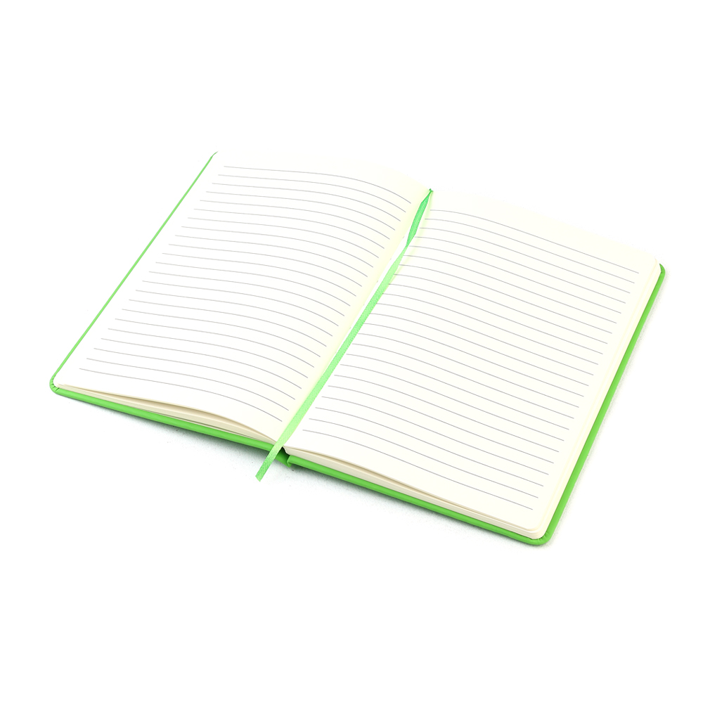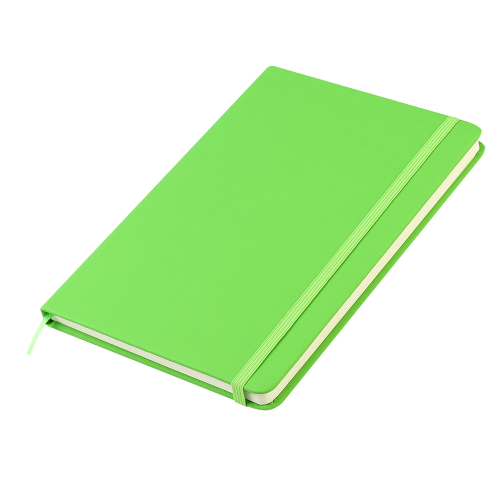 - Блокнот формата А5 с твердым покрытием из PU-материала с имитацией рисунка кожи, с эластичной застежкой для закрытия и текстильной закладкой в цвет блокнота, 192 страницы, плотность 70г/м, страницы с черными линиями.