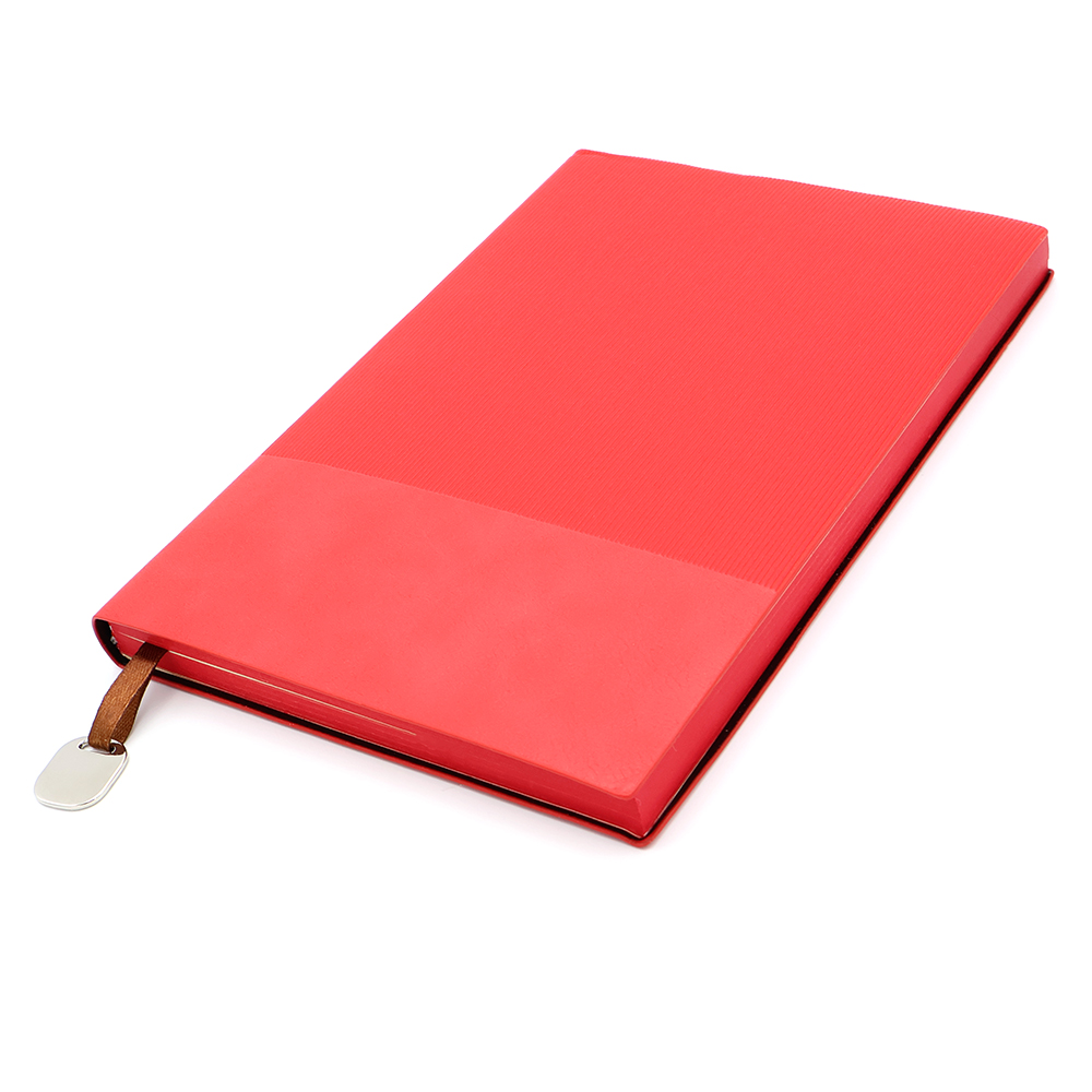 - Блокнот формата А5 в гибкой обложке из искусственной кожи. Материал обложки — термополиуретан. Текстура — сверху на 2/3 ребристая, на треть снизу — гладкая для нанесения вашего логотипа. Размеры: 210*145 мм, 240 страниц / 120 листов, страницы разлинеенные, бумага плотностью 80 г/м2. Срез страниц прокрашен в цвет обложки блокнота. В аксессуарах представлены: ляссе c металлической биркой. На бирку можно заказать нанесение логотипа вашей компании.