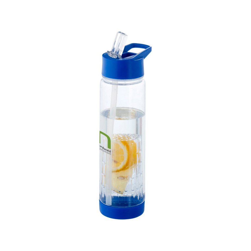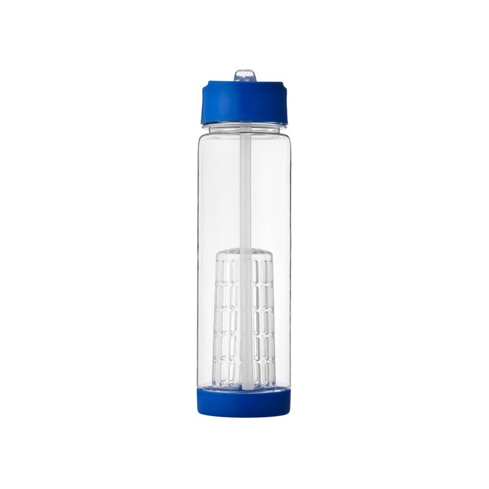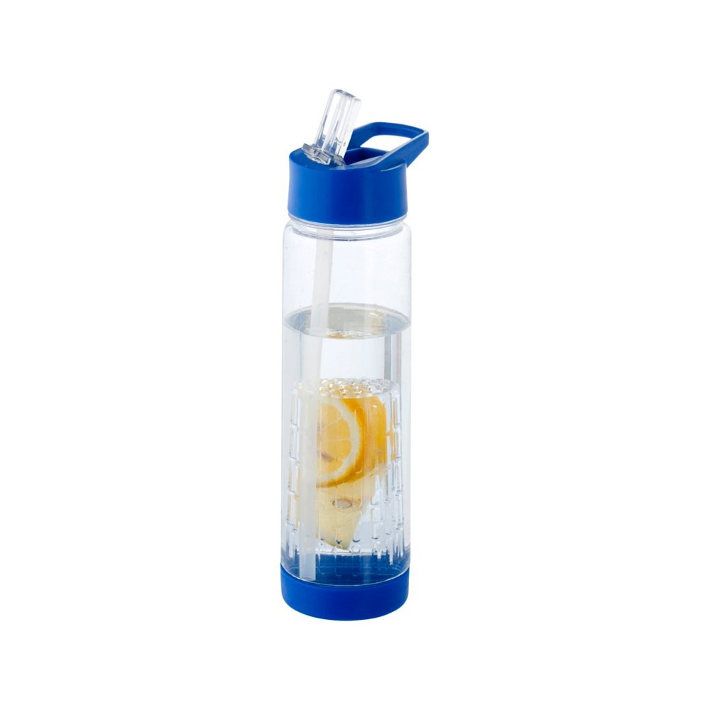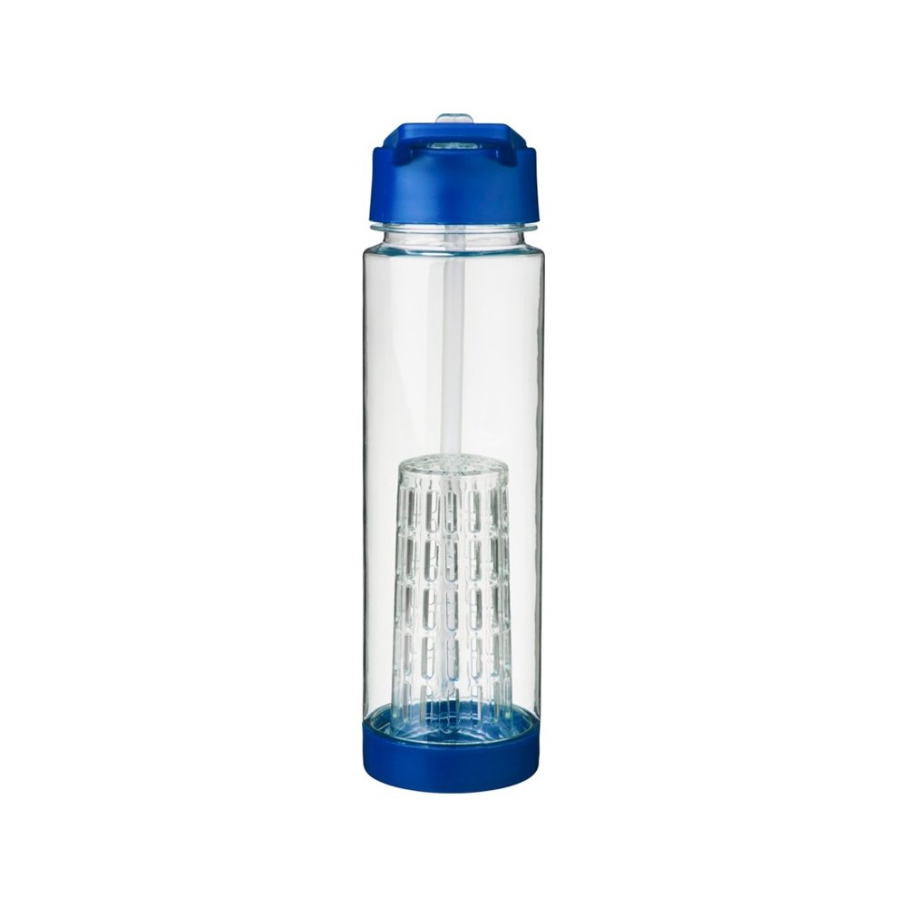 - Оригинальная бутылка для воды. Благодаря отделению для фруктов есть возможность создания лимонада на свой вкус. Придется по вкусу любителям натуральных продуктов и здорового образа жизни. Легко разбирается. На пластиковый корпус возможно нанесение тампопечати. Объем – 740 мл.