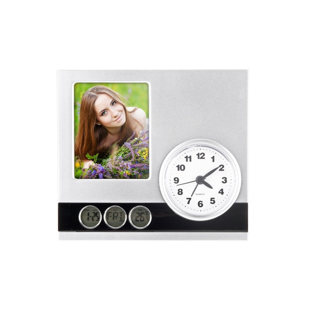- Оригинальные часы в корпусе из пластика – это не только прибор для определения времени. Часы также показывают дату и температуру воздуха, а в рамку для фотографий, расположенную выше, можно вставить фото близких людей.