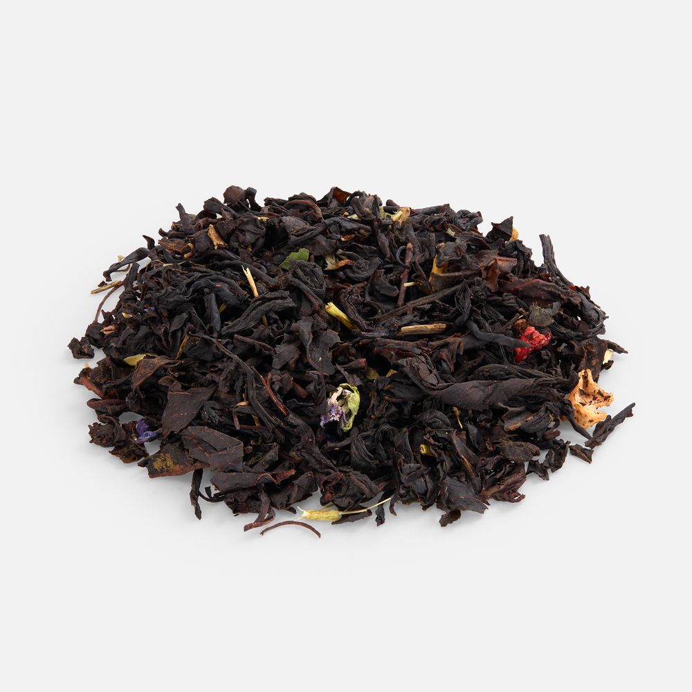 - Праздничный купаж на основе черного чая, украшенный цветочными лепестками и кусочками клубники.
