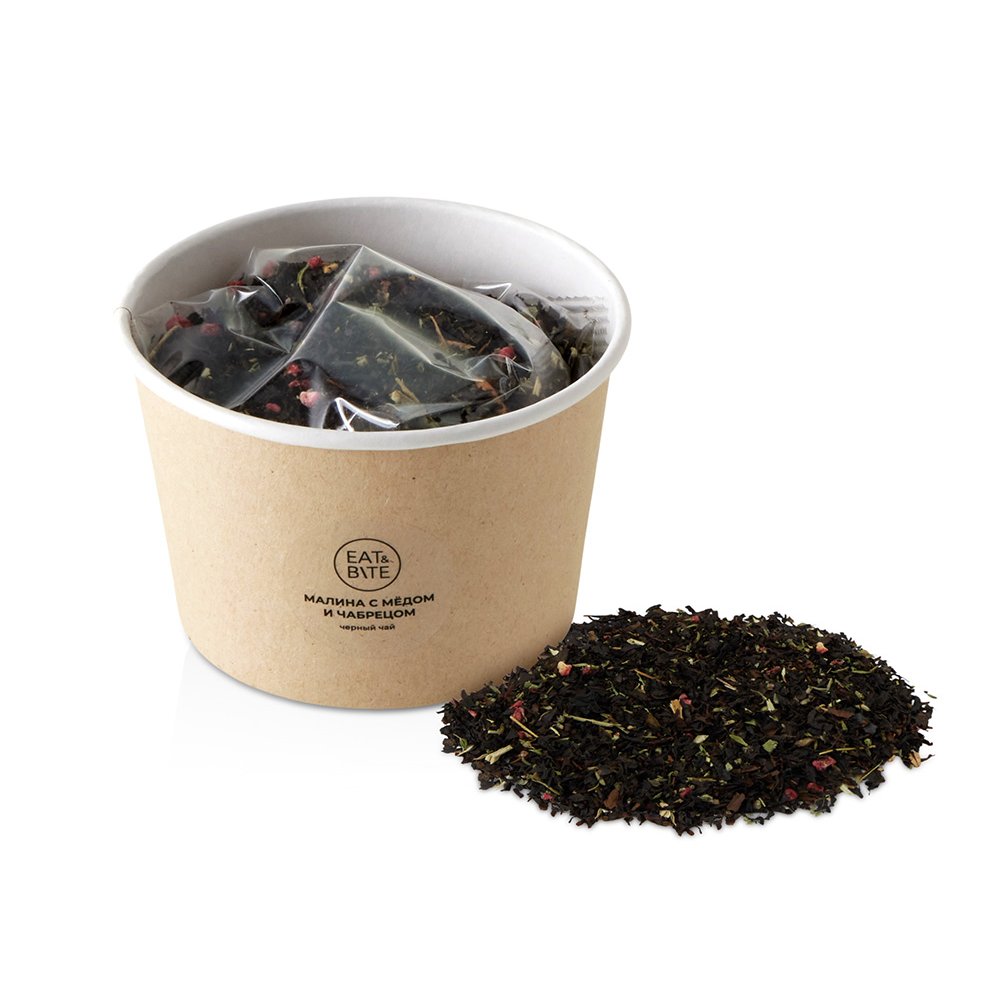 - Черный чай/листья ежевики/чабрец/кусочки сублимированной малины/ароматизатор натуральный "Малина"/ароматизатор натуральный "Мед"