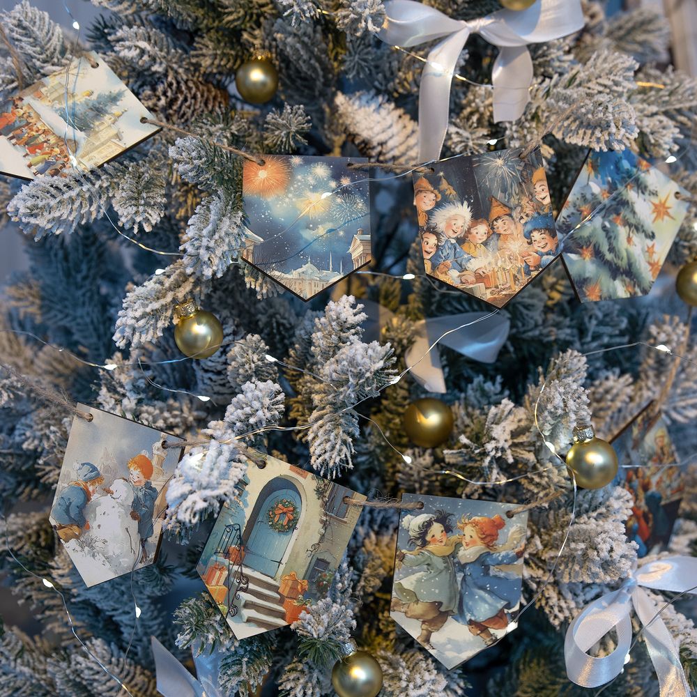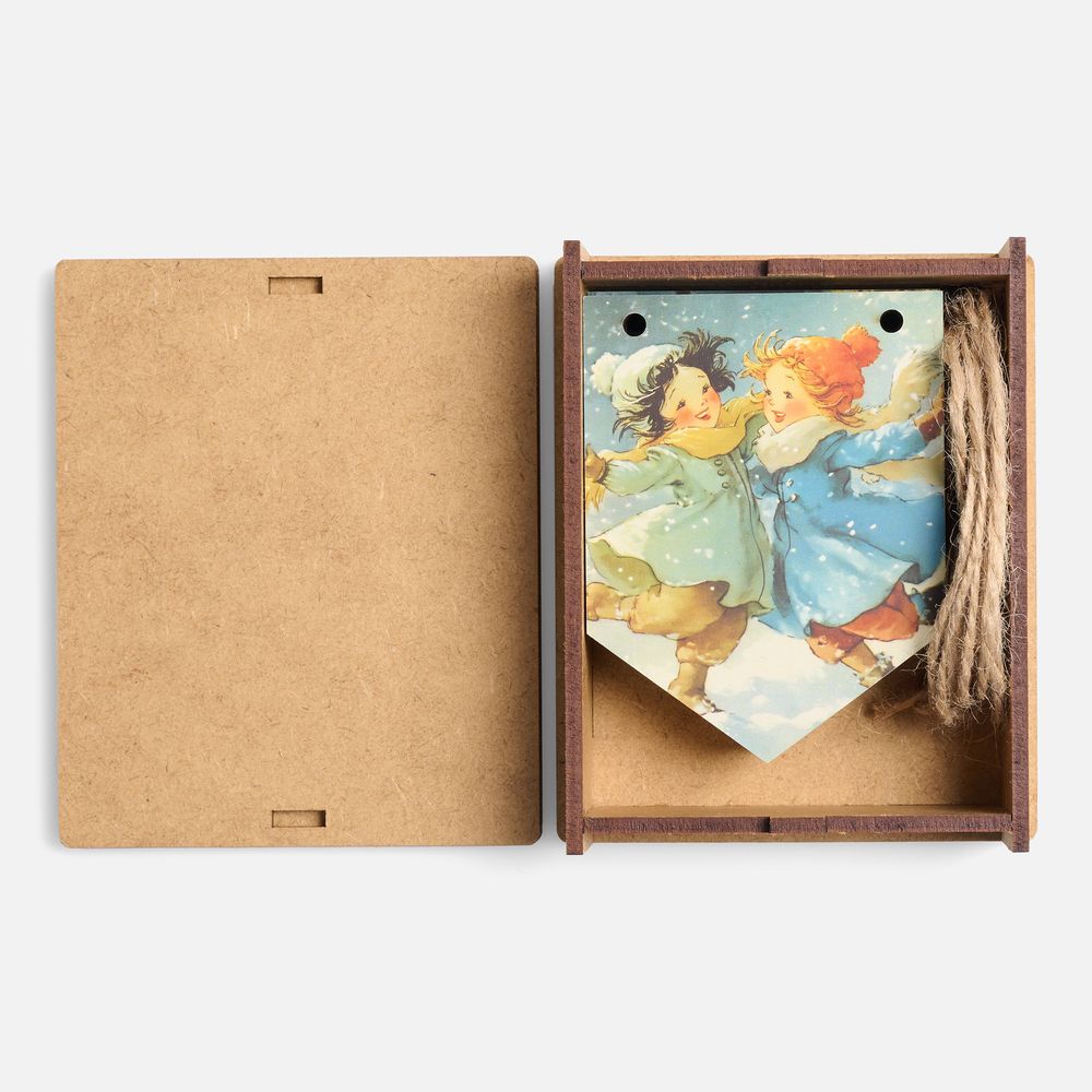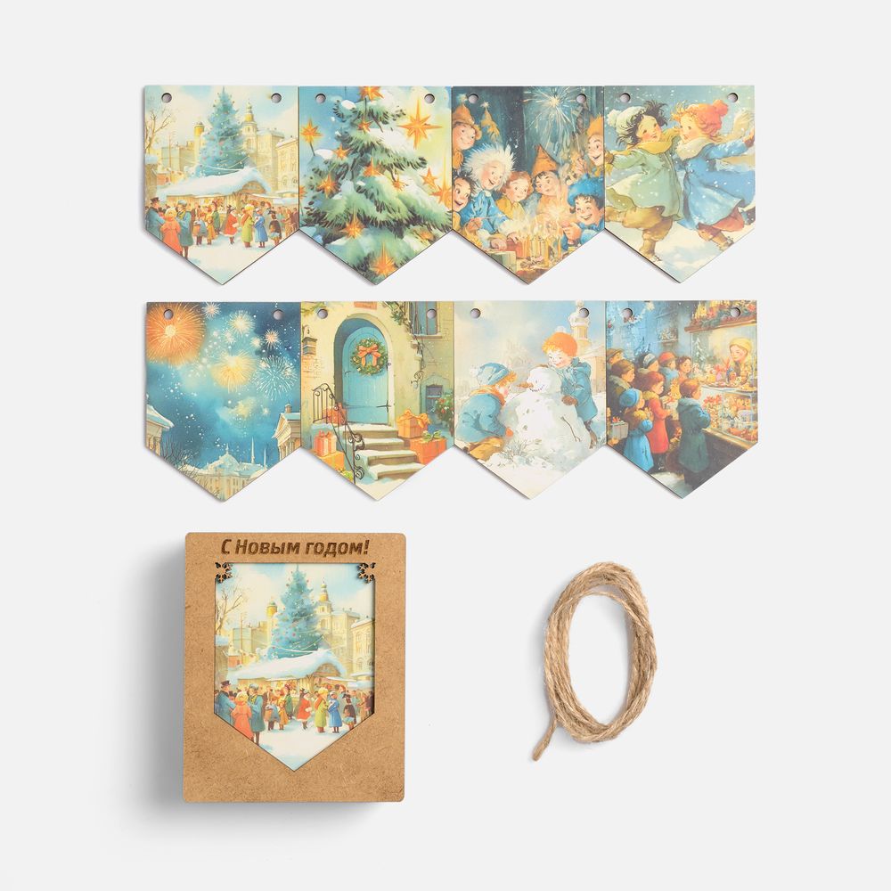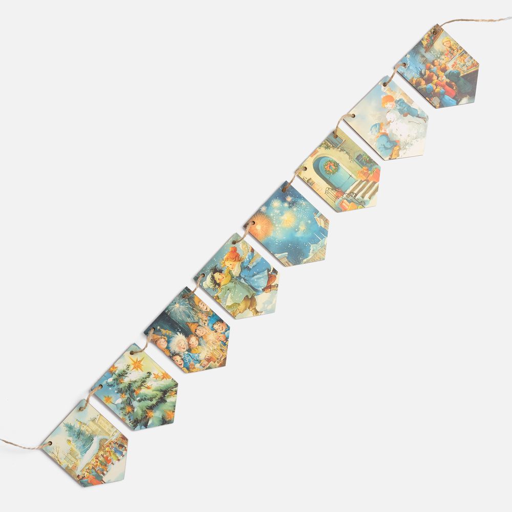 - Очаровательная гирлянда из деревянных флажков с винтажными рождественскими иллюстрациями создаст уютную праздничную атмосферу дома или в офисе. Каждый флажок украшен теплыми душевными изображениями, будто сошедшими со старинных открыток. Они с легкостью перенесут в мир новогодних сказок и детских фантазий — туда, где и хочется оказаться в самое волшебное время года!
