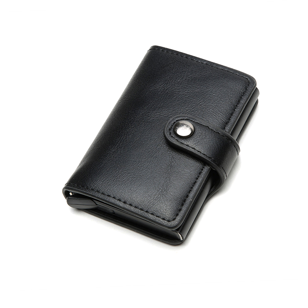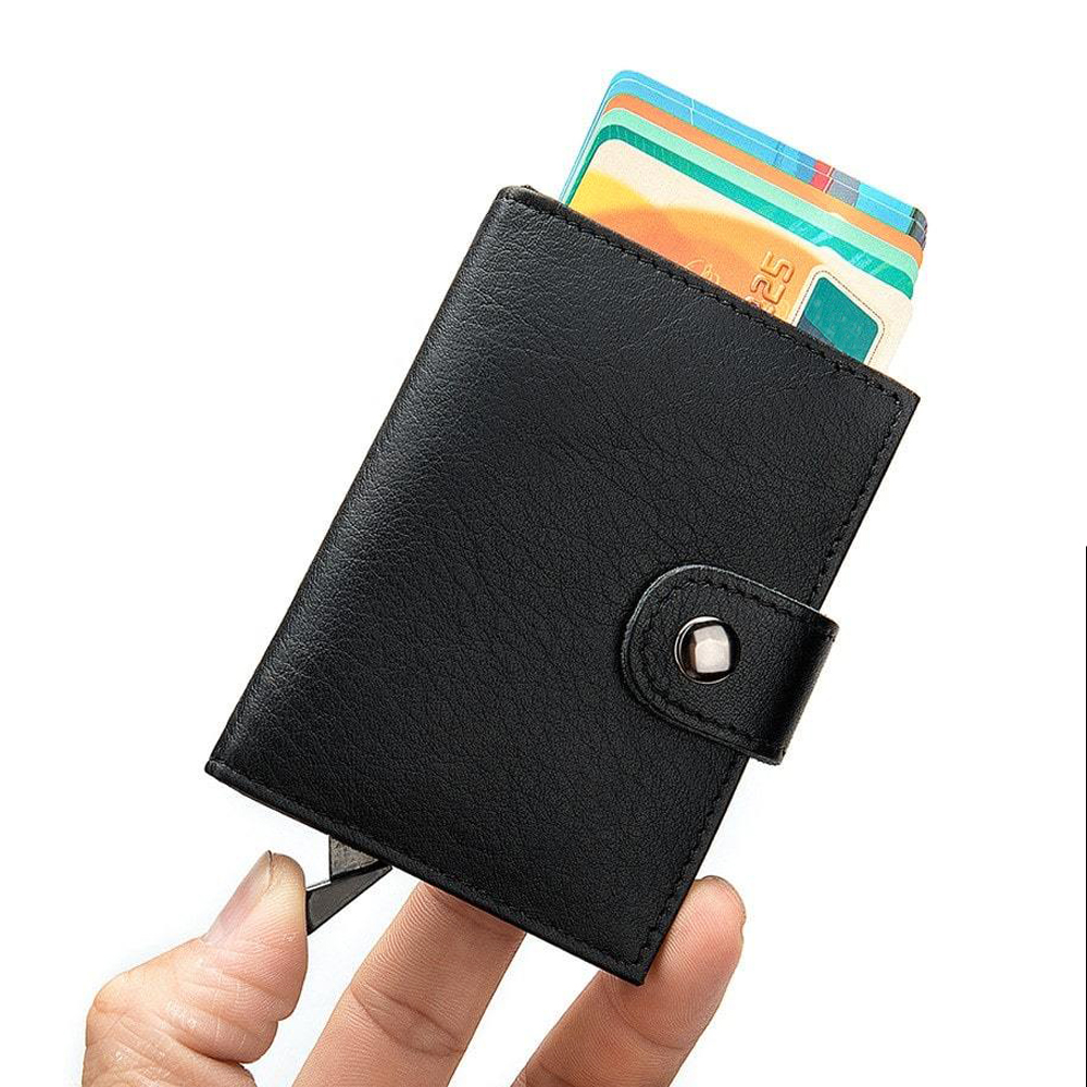 - Солидный практичный держатель для банковских карт Bakara с покрытием из экокожи книжного типа и возможностью закрывать, а также функцией RFID, чтобы защитить карты он несанкционированного копирования. Имеет нижнюю кнопку для быстрого извлечения карт.