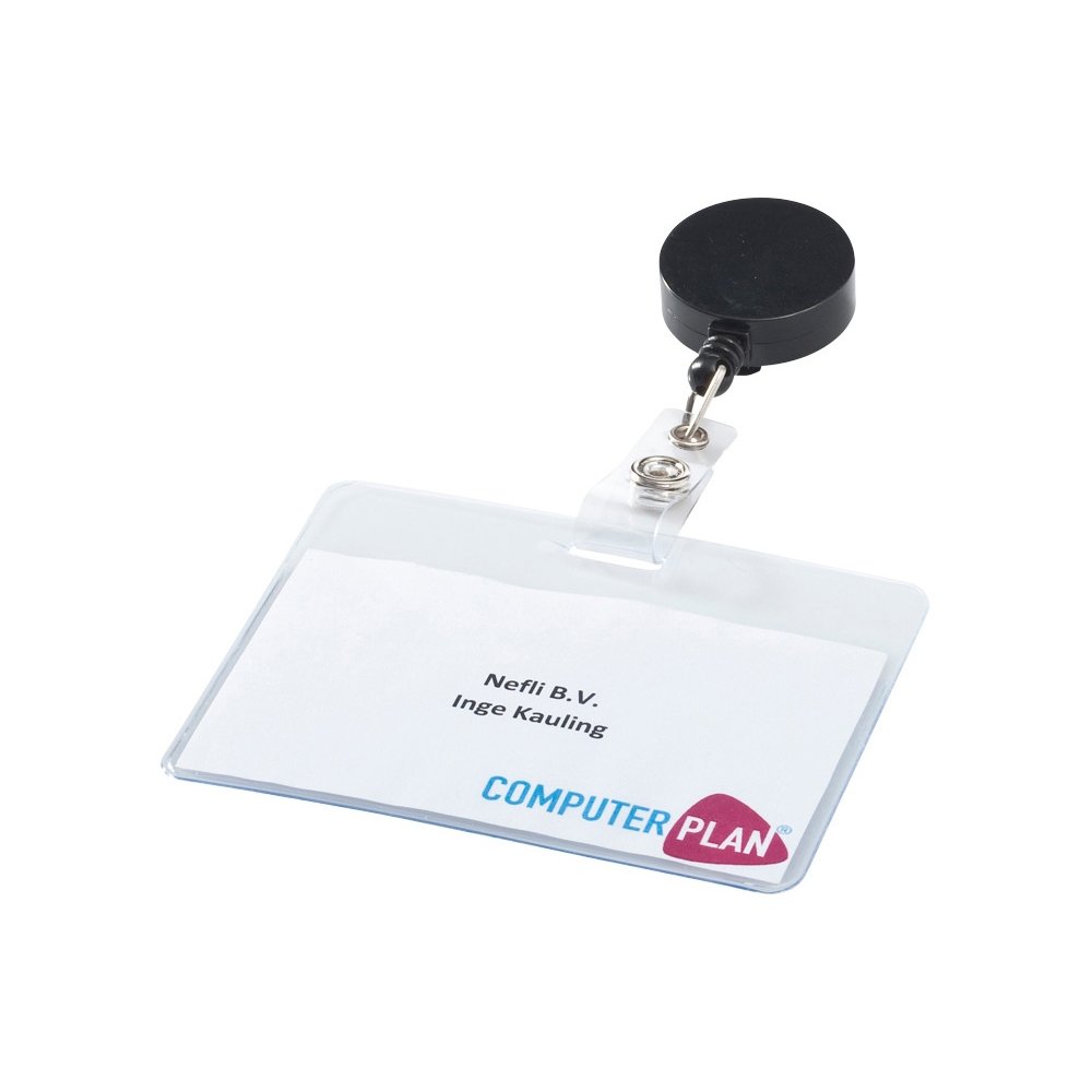 - Совершенно необходимая вещь в офисе с современной системой безопасности или на презентации – это держатель для бейджа или карты доступа. Черный, синий и белый цвета. На пластиковый корпус можно сделать нанесение логотипа компании.