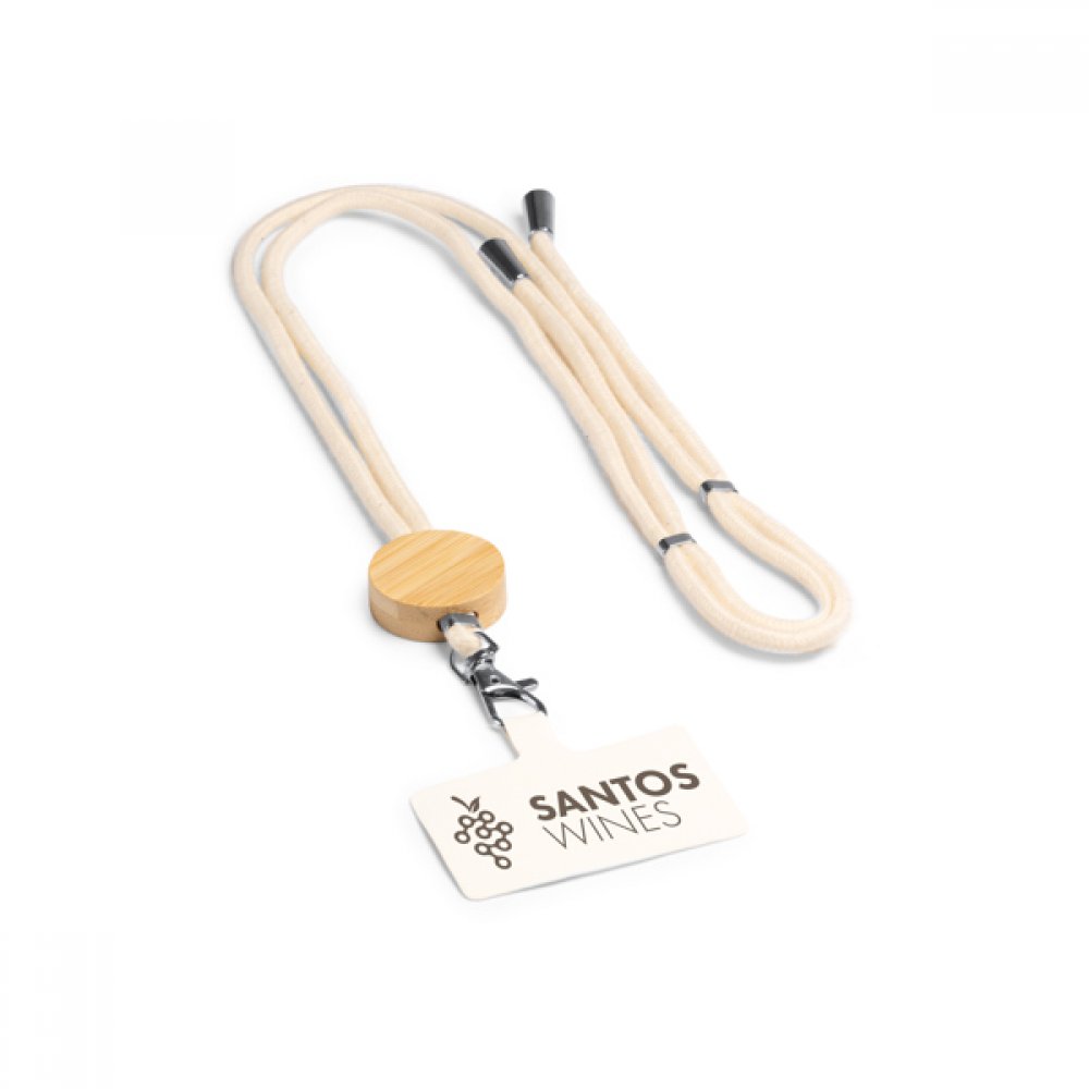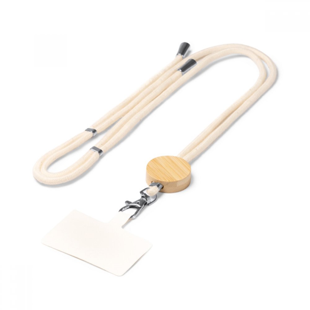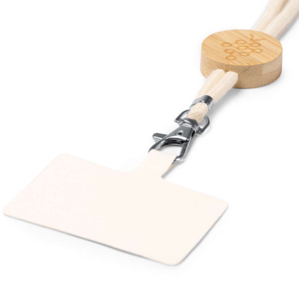 Хлопковый держатель для мобильного телефона со шнуром, с бамбуковой деталью и системой регулировки.
