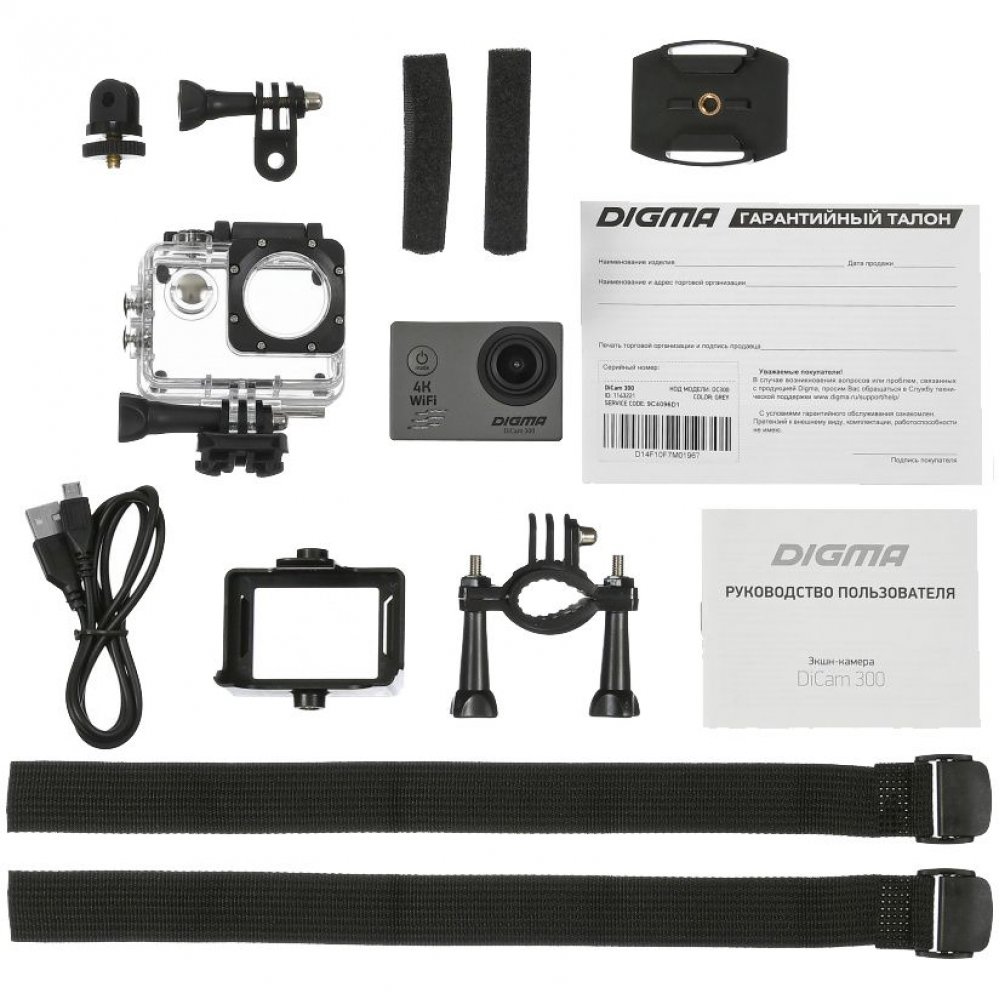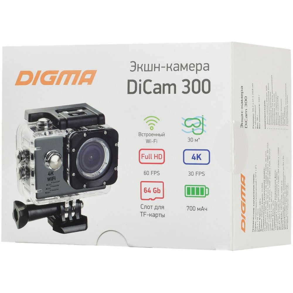 - Экшн-камера Digma DiCam 300 идеально подходит активным людям, живущим на большой скорости. Полная комплектация позволяет использовать камеру в любой ситуации: ее можно крепить на велосипед, на шлем, в авто и даже на повязку-бандаж.