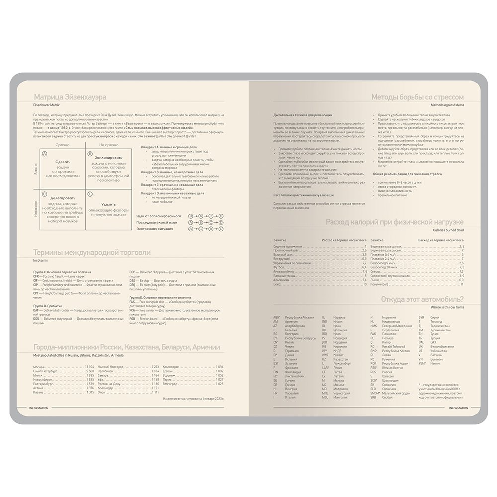 - Элегантный датированный ежедневник "Megapolis Color" от Bruno Visconti идеально подходит для организации рабочего дня и ведения важных записей. Обложка из искусственной кожи с приятным на ощупь покрытием Soft Touch и обрез в тон создают гармоничный образ. Внутри – блок из бежевой бумаги плотностью 70 г/кв.м с разделами для планирования, календарем на 2026-2027 год и полезной справочной информацией. Для удобства навигации предусмотрена закладка-ляссе шириной 7 мм в цвет обложки.