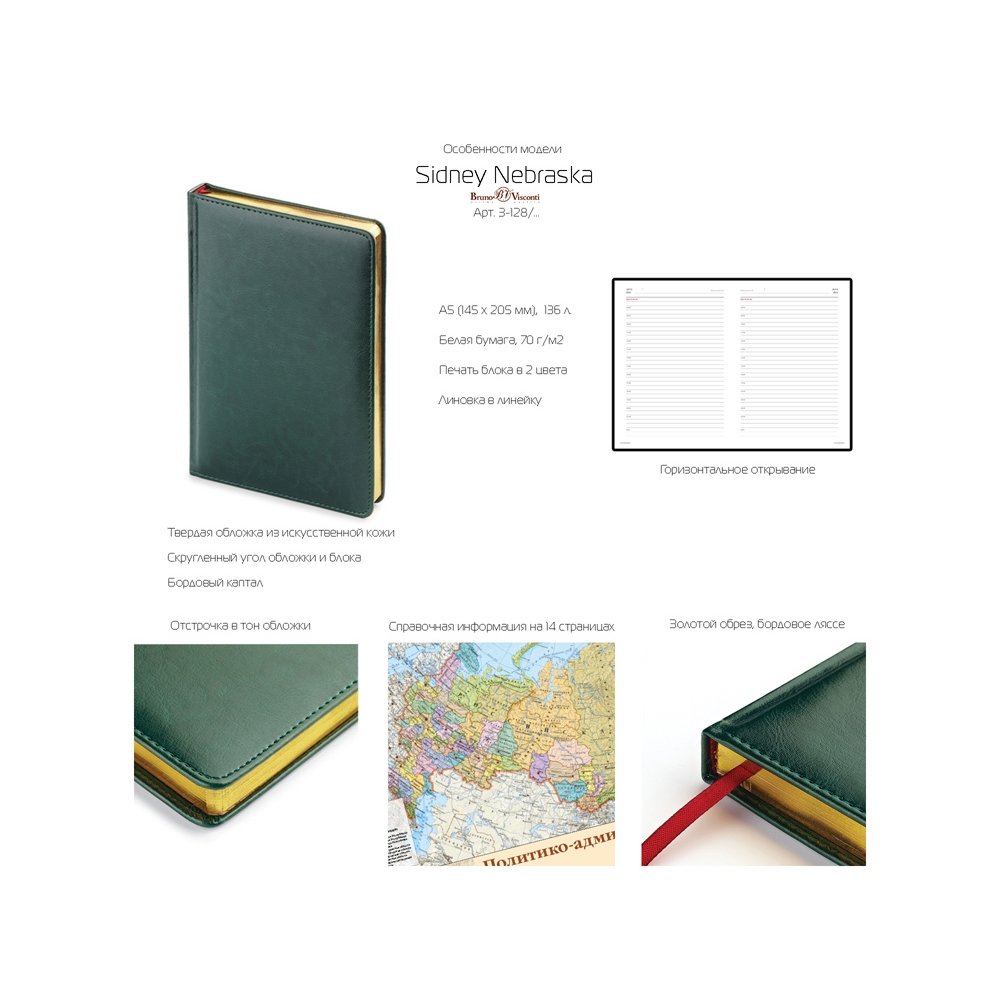 - Датированный ежедневник «SIDNEY NEBRASKA" формата А5 на 2026 год - идеальный помощник в деле планирования рабочего времени для тех, кто ценит рационализм и функциональность. Твердая обложка из искусственной кожи с благородной глянцевой поверхностью, максимально повторяющей фактуру натуральной кожи, и практичный книжный переплет надежно предохраняют блок от механических повреждений. Благородство и статусность придают ежедневнику отстрочка по периметру в тон, скругленные углы, закладка-ляссе бордового цвета, золотой срез. Внутренний блок выполнен из белой бумаги плотностью 70 г/кв.м и имеет раздел справочной информации на 16 страницах.