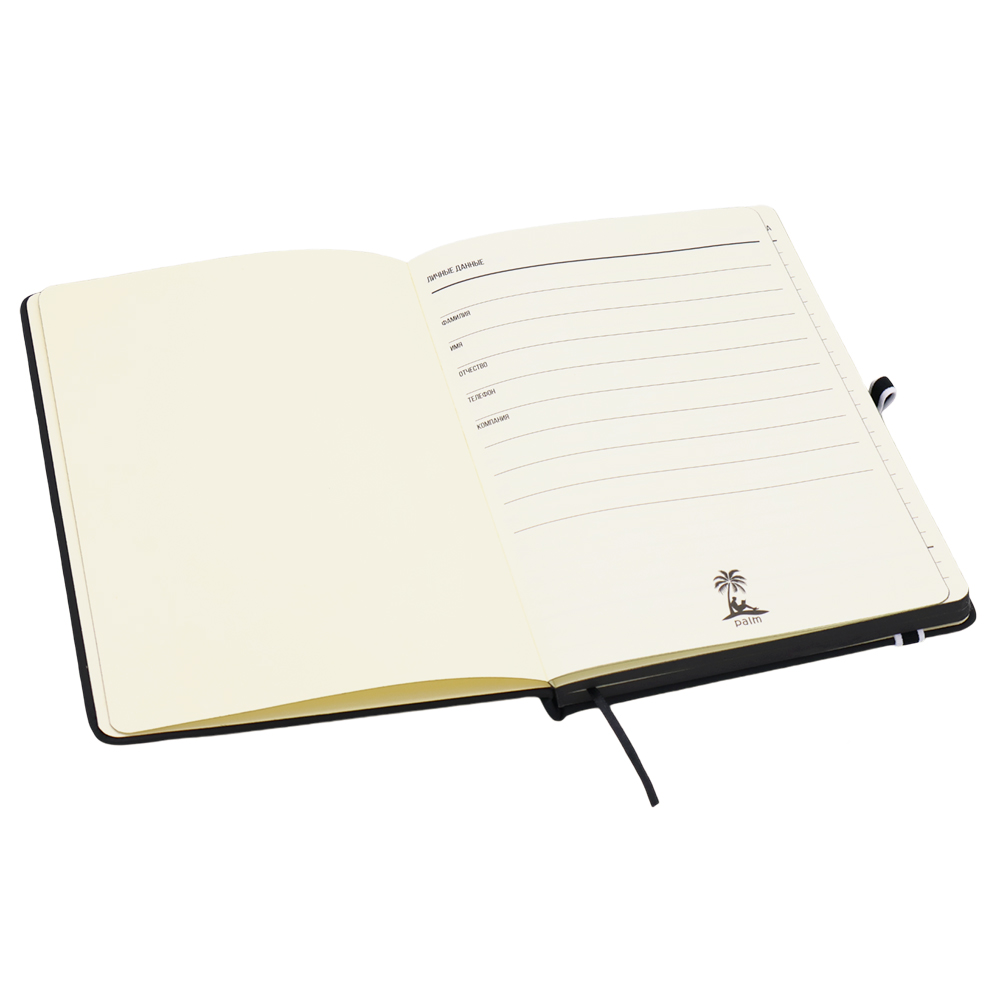 - Ежедневник Sir Lewis — выполнен в твердой обложке. Имеет удобную, широкую резинку (1 см.) и держатель для ручки с ярким акцентом. Закладка и край — также в черном цвете. В начале ежедневника страничка с личными данными. Тактильный на ощупь, его не хочется отпускать! Только вы, ваши мысли и PALM™.