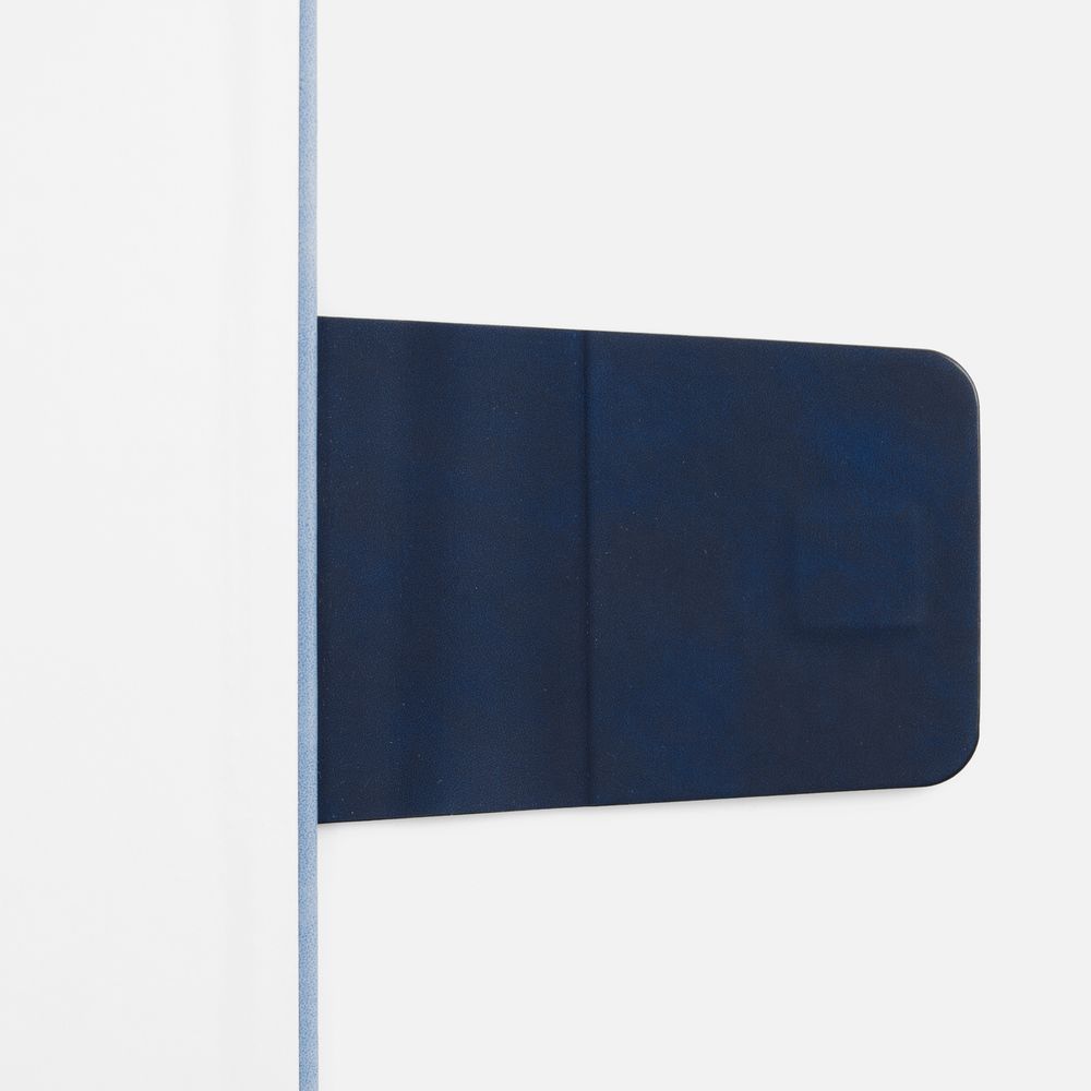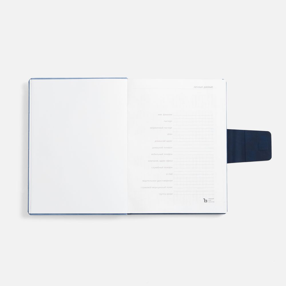 Ежедневник с твердой обложкой, выполнен из материала Nubuck Touch, голубой JJ, дополнен капталом, ляссе и обрезом синего цвета. Застежка — хлястик на магните из материала Nubuck Touch, темно-синий ХХ.