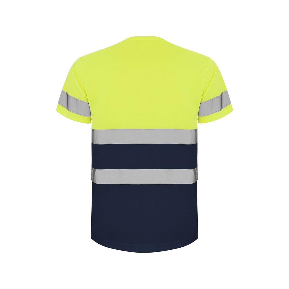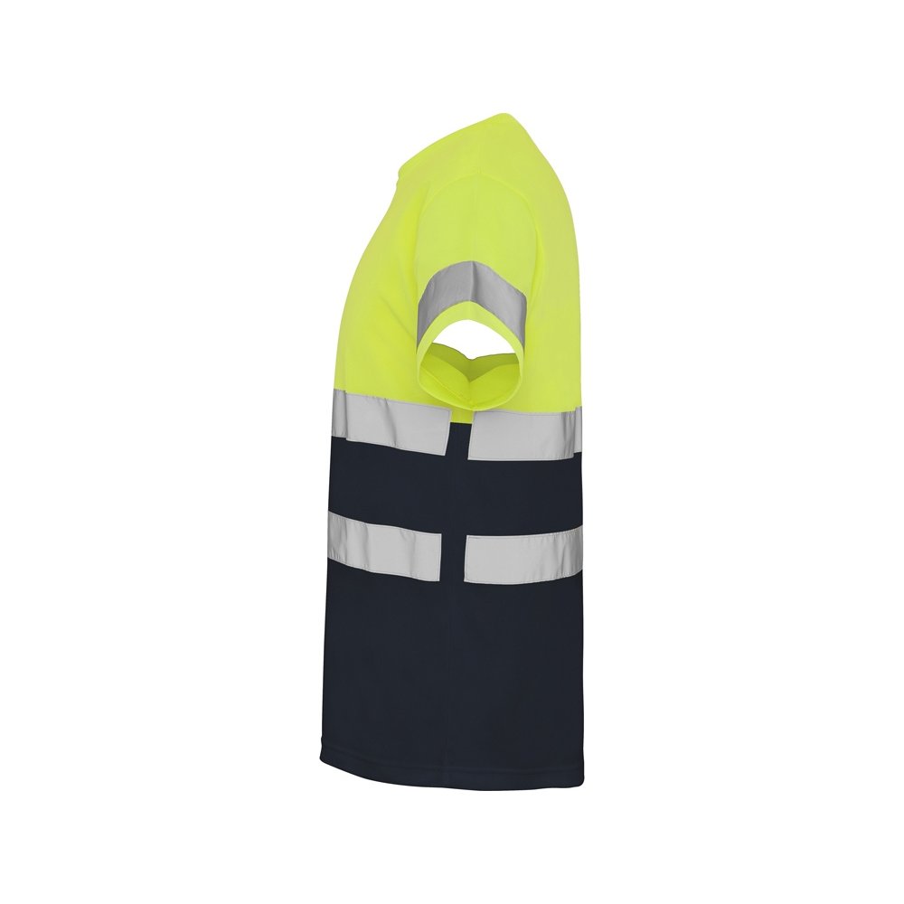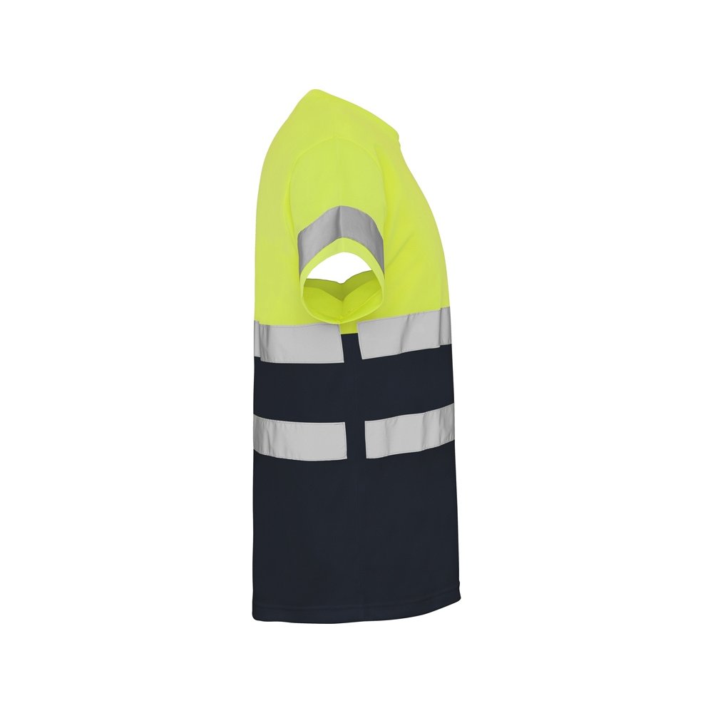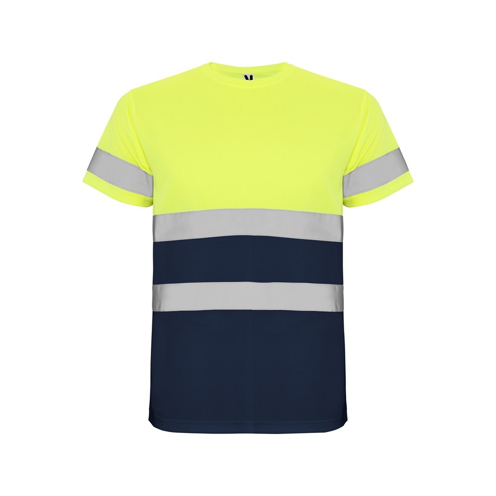 - Футболка со светоотражающими элементами с короткими рукавами. Круглая горловина из той же ткани, с усиленными закрытыми швами на внутренней стороне горловины. Две горизонтальные светоотражающие полосы на туловище и одна светоотражающая полоса на рукавах.