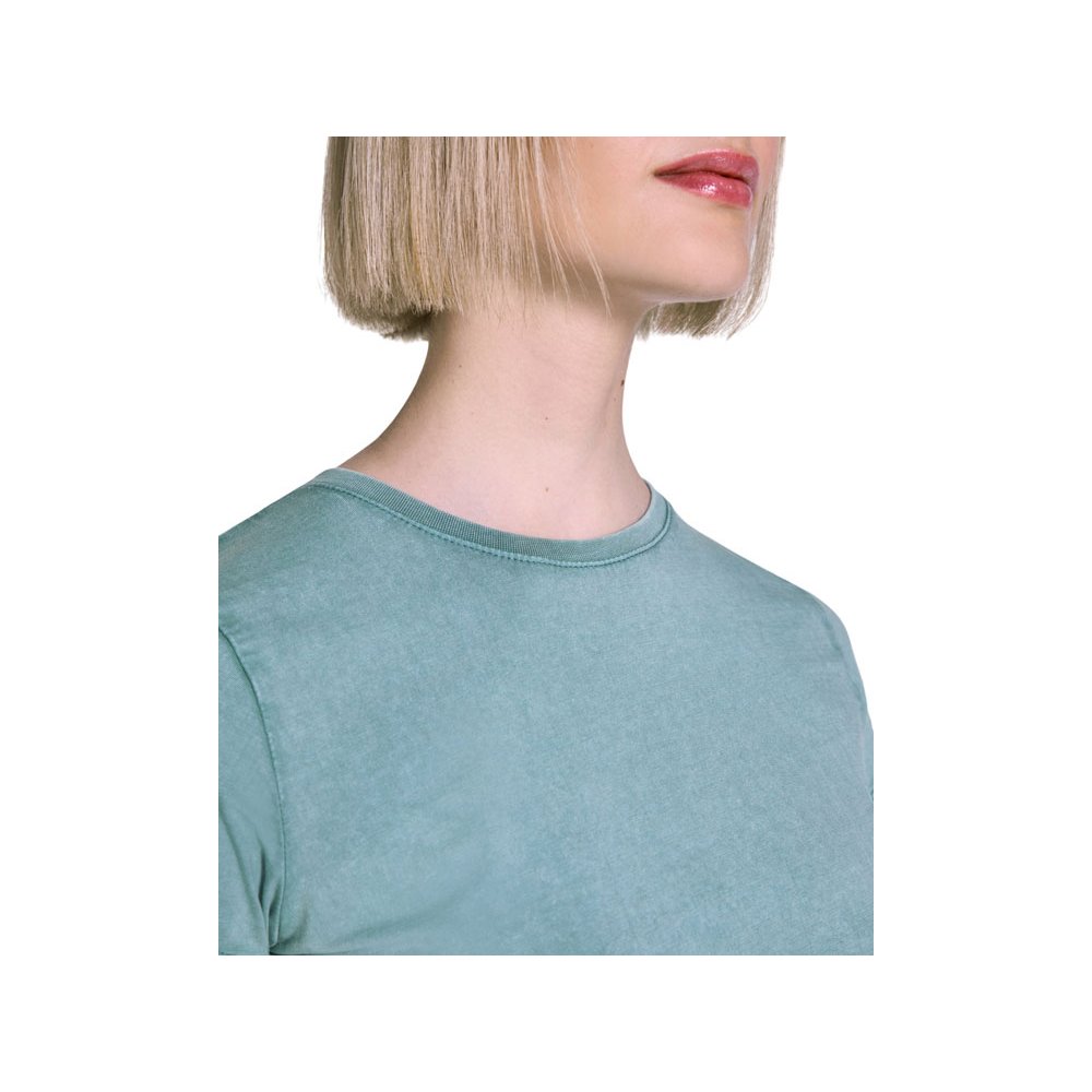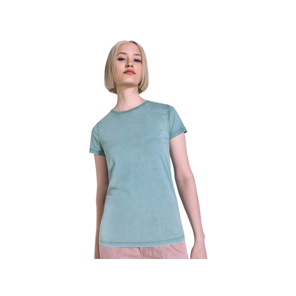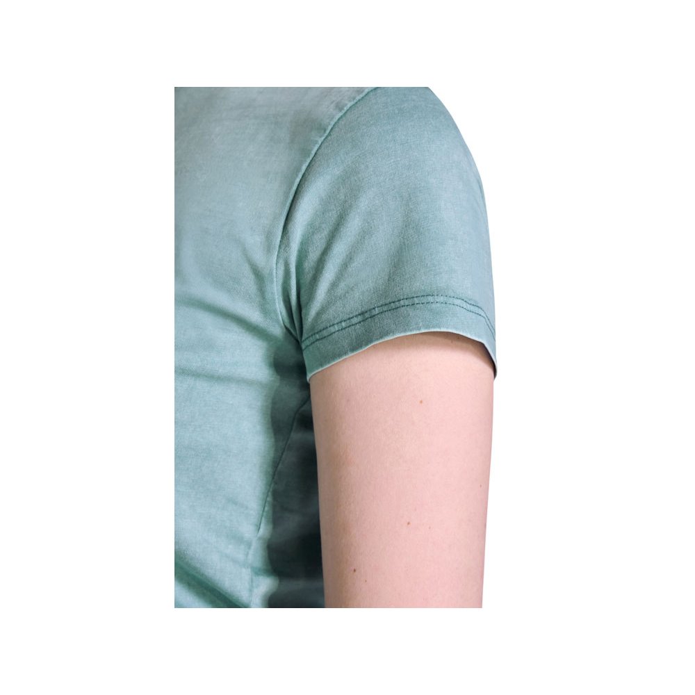 - Женская футболка с коротким рукавом из 100% хлопка с аксидной стиркой. Круглый вырез горловины из риба 1х1. Отстрочка в тон по горловине.
