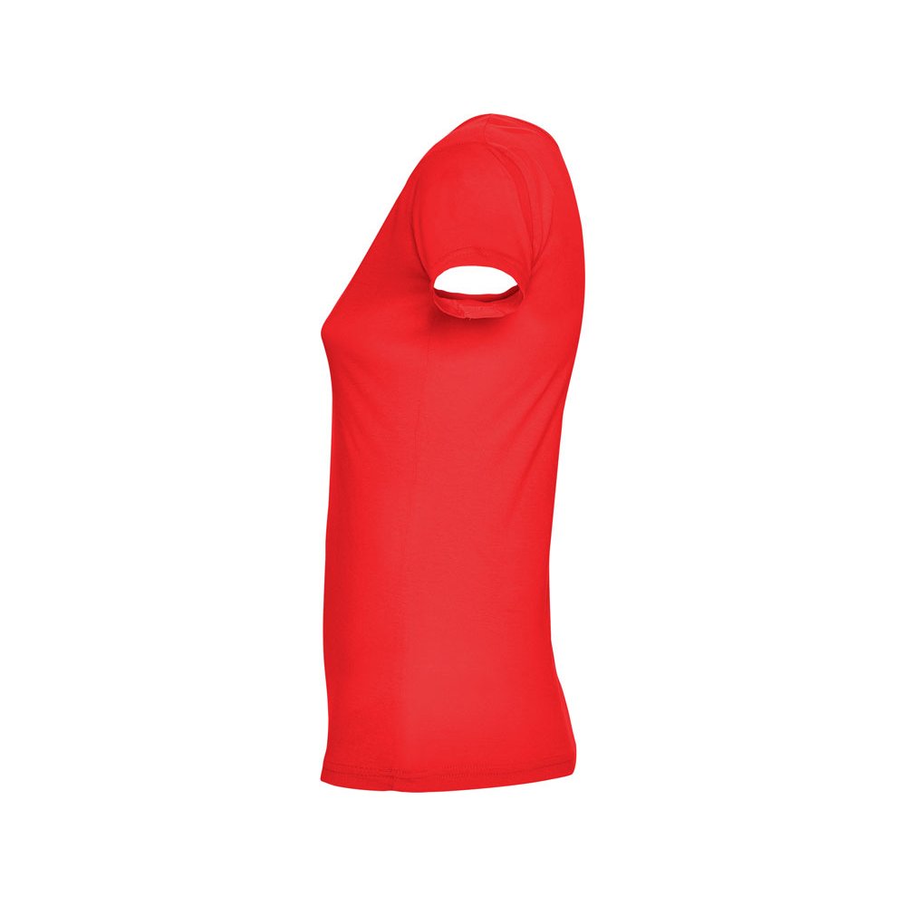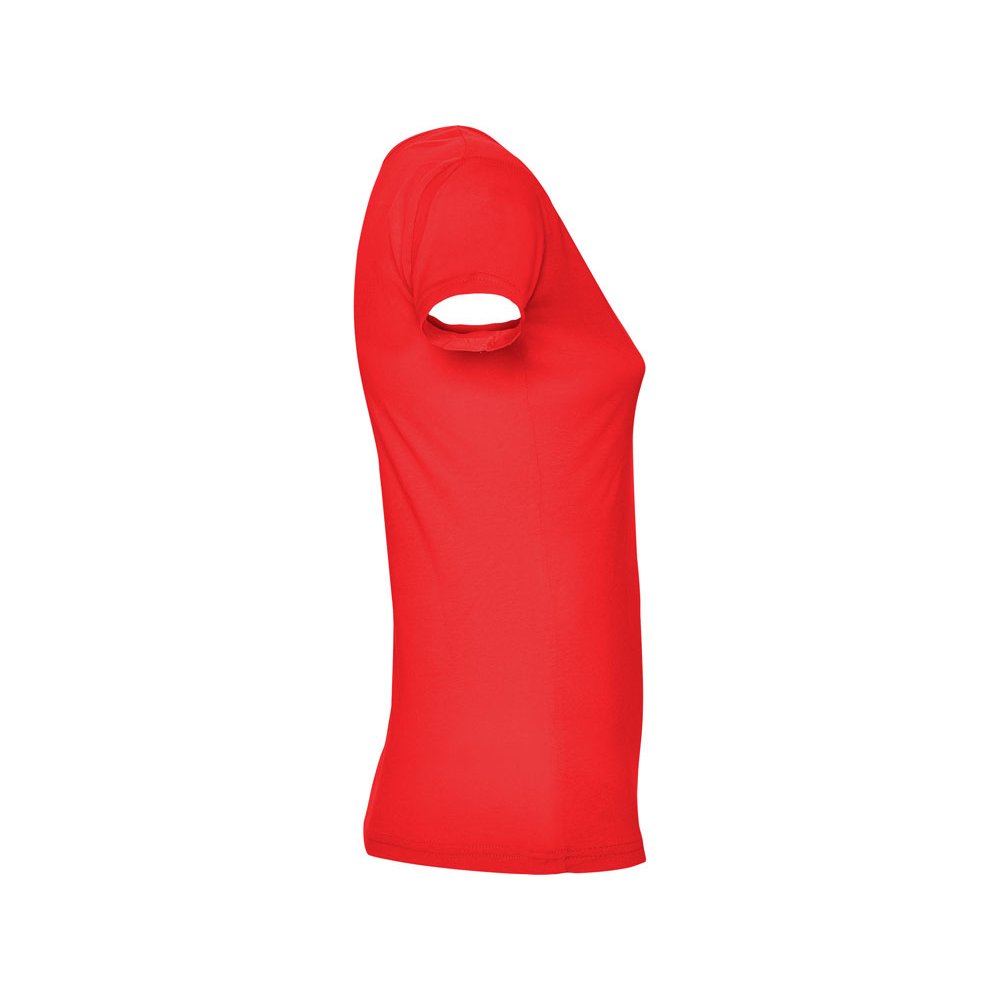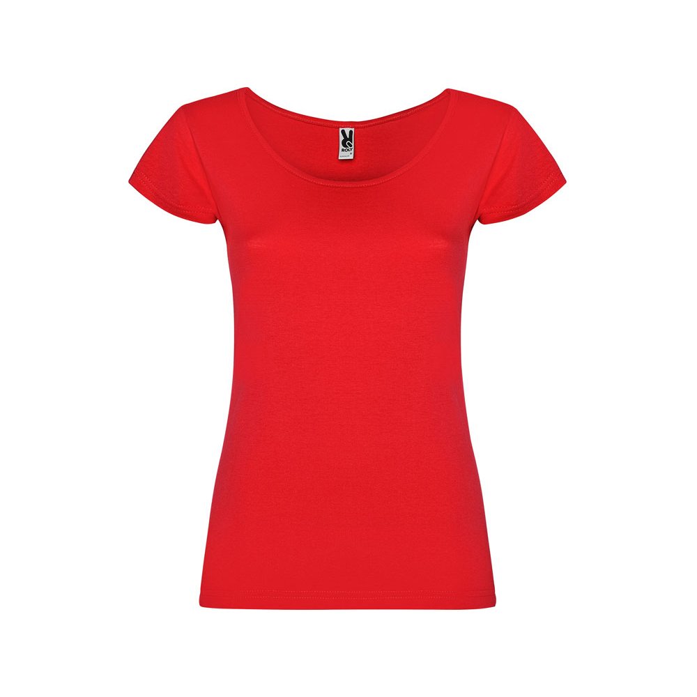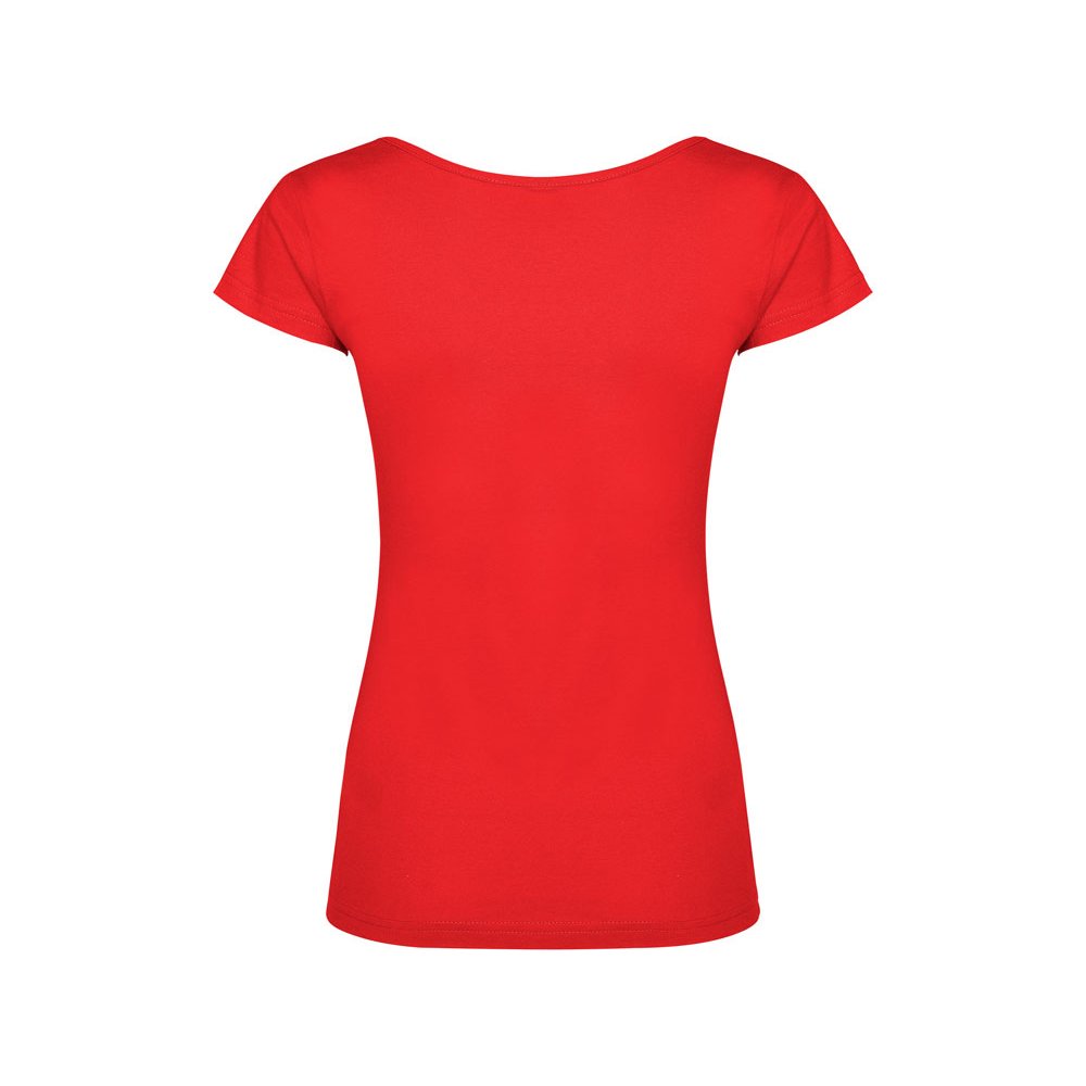 - Прилегающая женская футболка с глубоким вырезом, обработанным рибом.
