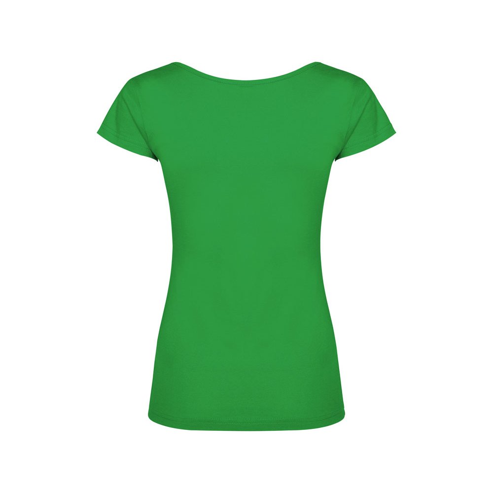 - Прилегающая женская футболка с глубоким вырезом, обработанным рибом.