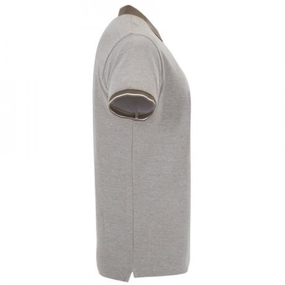 - Футболка поло меланжевого цвета с короткими рукавами. Воротник и манжеты рукавов однотонного цвета в рубчик 1 x 1 с контрастной декоративной полосой. Внутренняя планка с декоративной контрастной лентой на три пуговицы. Вырез внизу по бокам с усиленными шв