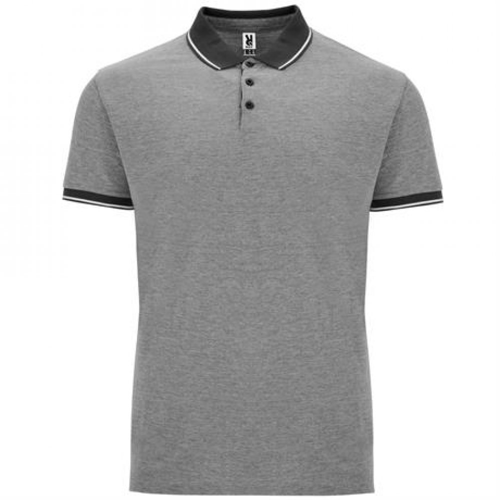- Футболка поло меланжевого цвета с короткими рукавами. Воротник и манжеты рукавов однотонного цвета в рубчик 1 x 1 с контрастной декоративной полосой. Внутренняя планка с декоративной контрастной лентой на три пуговицы. Вырез внизу по бокам с усиленными шв