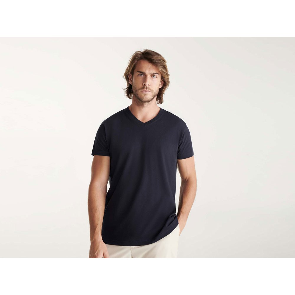 - Мужская футболка без боковых швов с коротким рукавом и V-образным вырезом горловины, отделанном рибом 1х1. Горловина и плечевые швы дополнительно укреплены тесьмой.