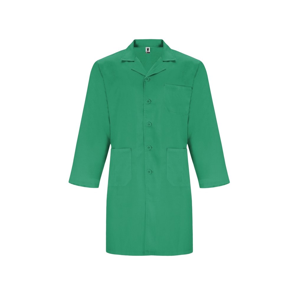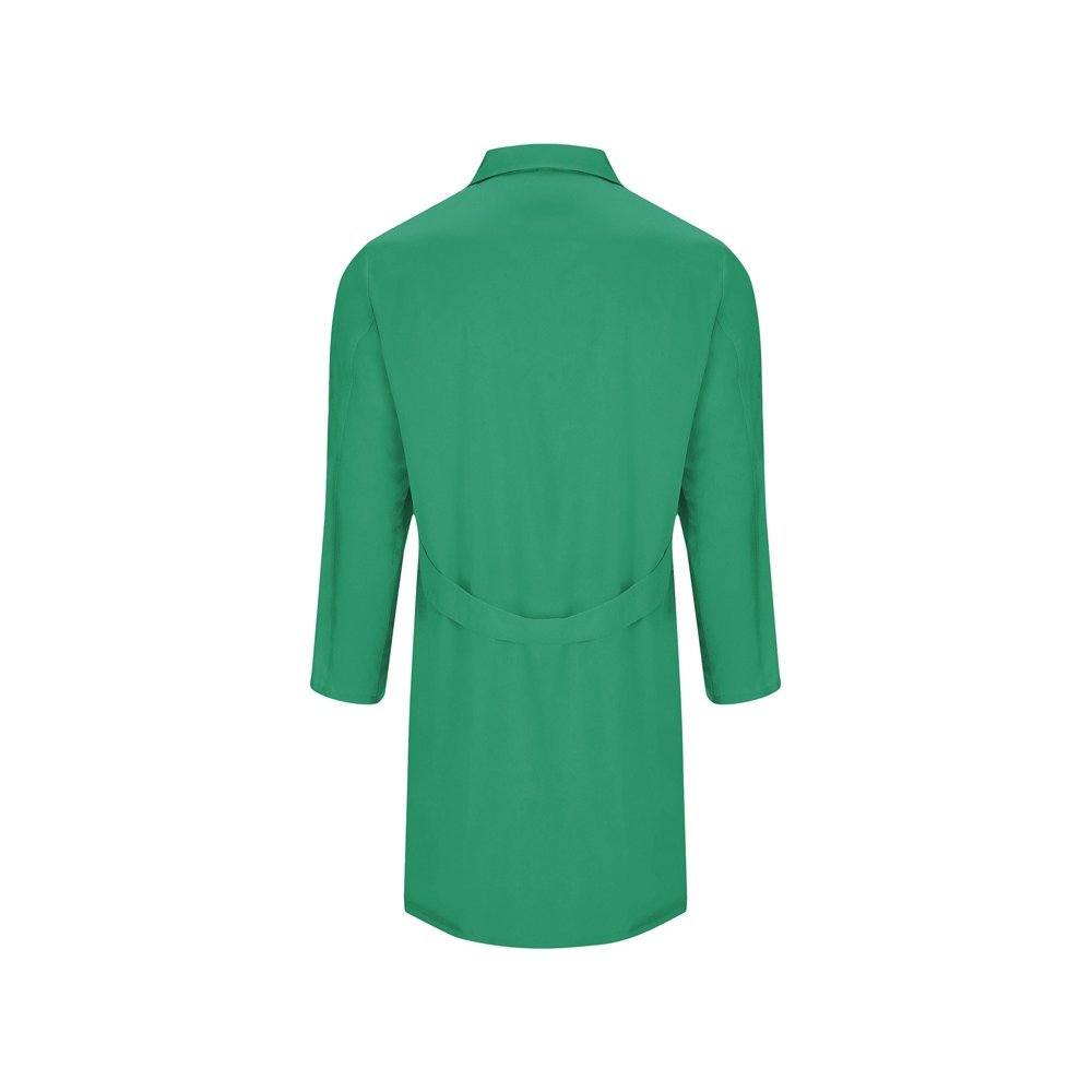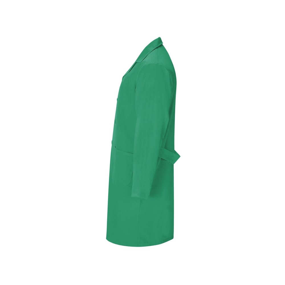 - Халат для персонала с длинными рукавами. · Воротник с лацканами. · Центральная застежка на 5 пуговиц в тон. · Один нагрудный карман и два кармана по бокам. · Пояс сзади.
