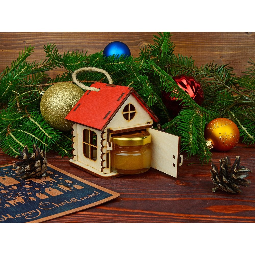 Подарочная упаковка “Домик” выполнена в виде игрушки, которую легко можно поставить на стол, шкаф или повесить на стену. Ее также можно использовать, как елочное украшение или новогодний подарок. Она изготовлена из экологически чистых материалов и обладает чарующим древесным ароматом. В домике открывается дверца, и в него можно поместить небольшую баночку с медом или вареньем. Яркие цвета крыши домиков и эффектная конструкция помогут украсить любой интерьер, как в офисе, так и в квартире. Подарочная упаковка “Домик” позволит вам сделать оригинальный и запоминающийся подарок для руководителя или коллеги.