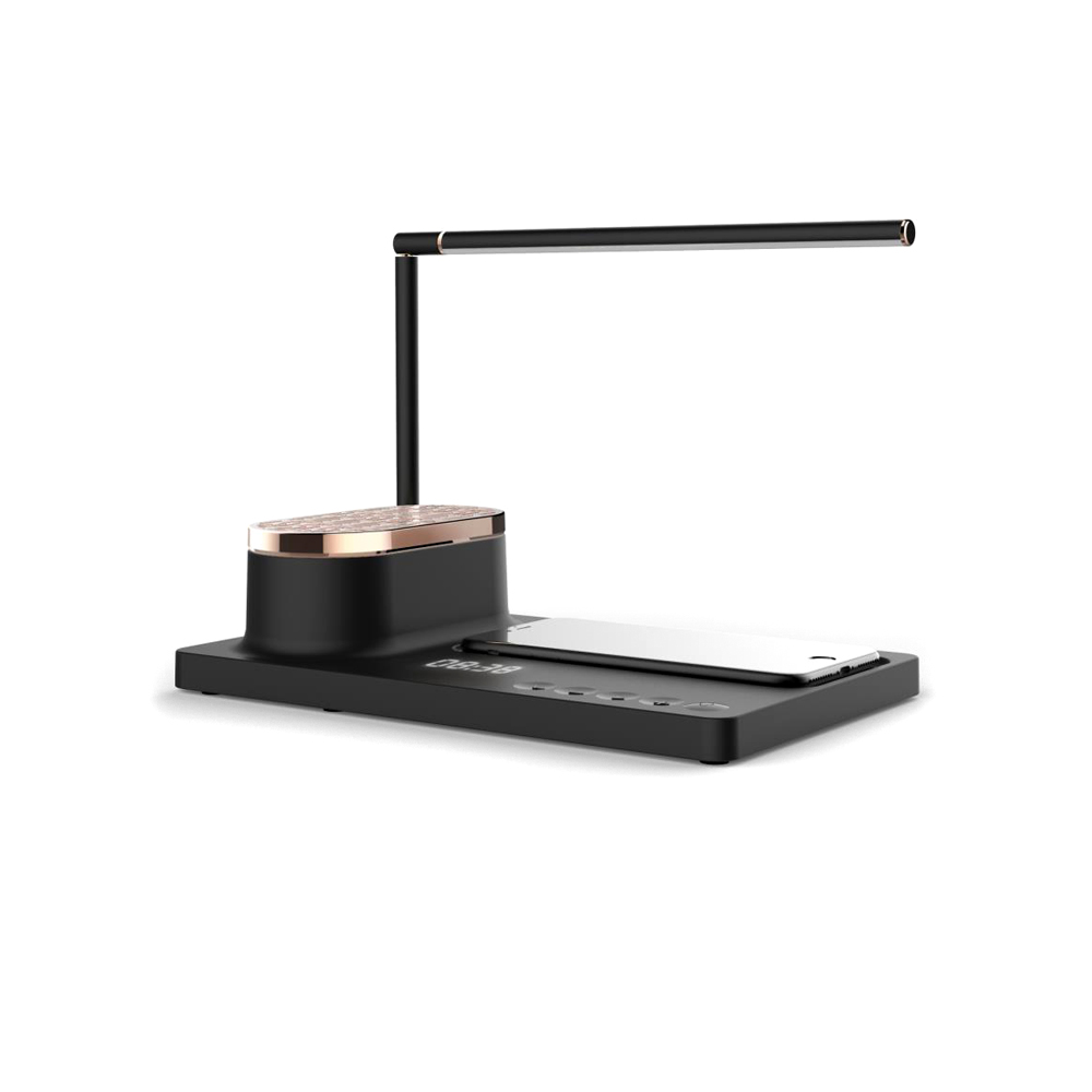 - Строгий дизайн и богатый функционал настольной лампы Volando позволит использовать ее как офисный аксессуар, так и как прикроватную лампу для ночного чтения. С функцией беспроводной зарядки Qi в основании и музыкальной проигрывающей bluetooth колонкой, а также дисплеем для отображения времени. Тип лампы LED, цветовая температура 4000-4500К, мощность лампы: 10W. Питание: 9V/2A. Беспроводная зарядка 9V-3A. Bluetooth JR4. Мощность колонки 5Ω/4W*2. В комплекте сетевой адаптер и инструкция.