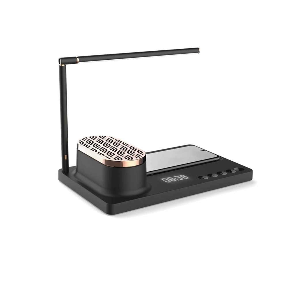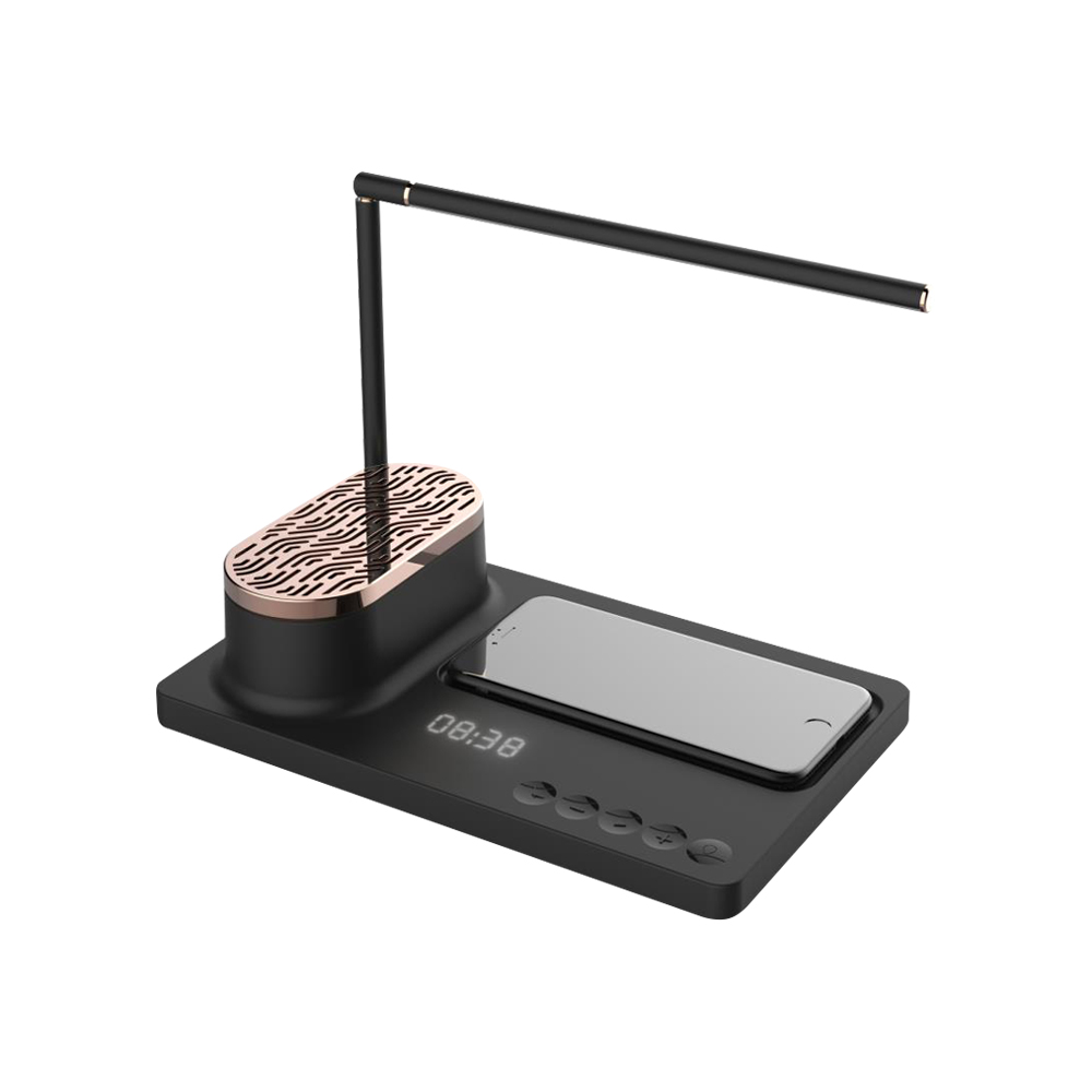 Строгий дизайн и богатый функционал настольной лампы Volando позволит использовать ее как офисный аксессуар, так и как прикроватную лампу для ночного чтения. С функцией беспроводной зарядки Qi в основании и музыкальной проигрывающей bluetooth колонкой, а также дисплеем для отображения времени. Тип лампы LED, цветовая температура 4000-4500К, мощность лампы: 10W. Питание: 9V/2A. Беспроводная зарядка 9V-3A. Bluetooth JR4. Мощность колонки 5Ω/4W*2. В комплекте сетевой адаптер и инструкция.