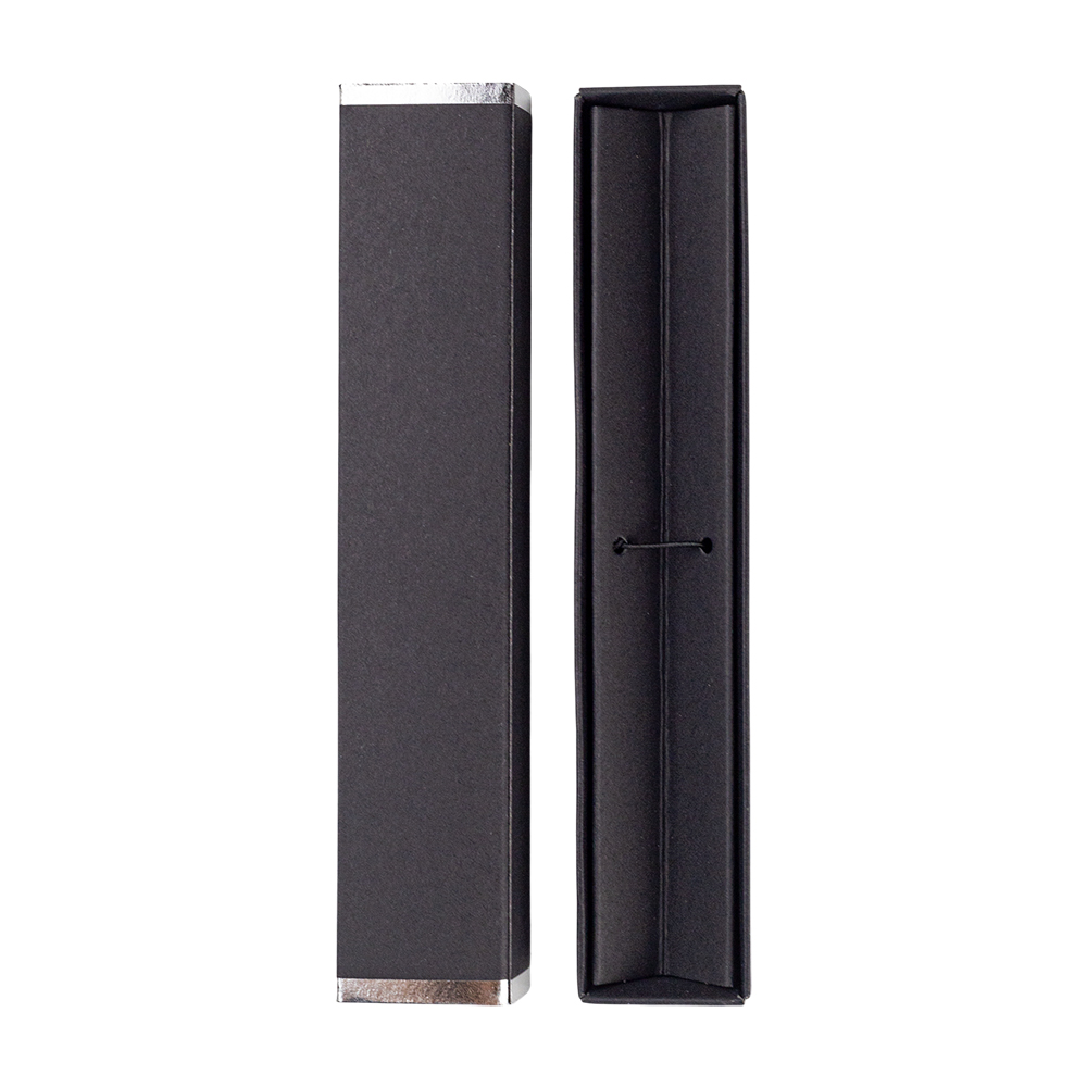 - Бумажная коробочка для ручки. Ложемент V-образный с резинкой, фиксирующей ручку. По краям крышки металлизированные декоративные элементы, для красоты. В такой коробочке подаренная ручка будет выглядеть ещё дороже, словно фотомодель в вечернем платье.