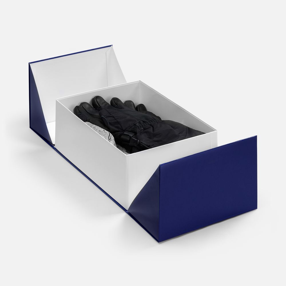 - Коробка из переплетного картона 2 мм с оригинальной конструкцией: две симметричные створки открываются, создавая эффектную презентацию содержимого. Складная система на предустановленный двусторонний скотч делает сборку коробки быстрой и интуитивно понятной.