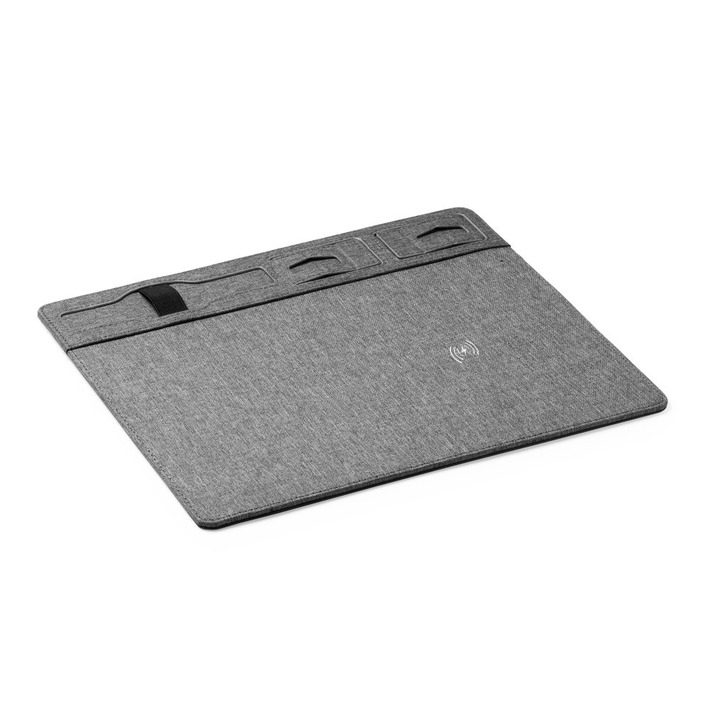 - Коврик для мыши из RPET со встроенным беспроводным зарядным устройством мощностью 10 Вт. В комплект входят подставка для мобильного телефона и для ручки.