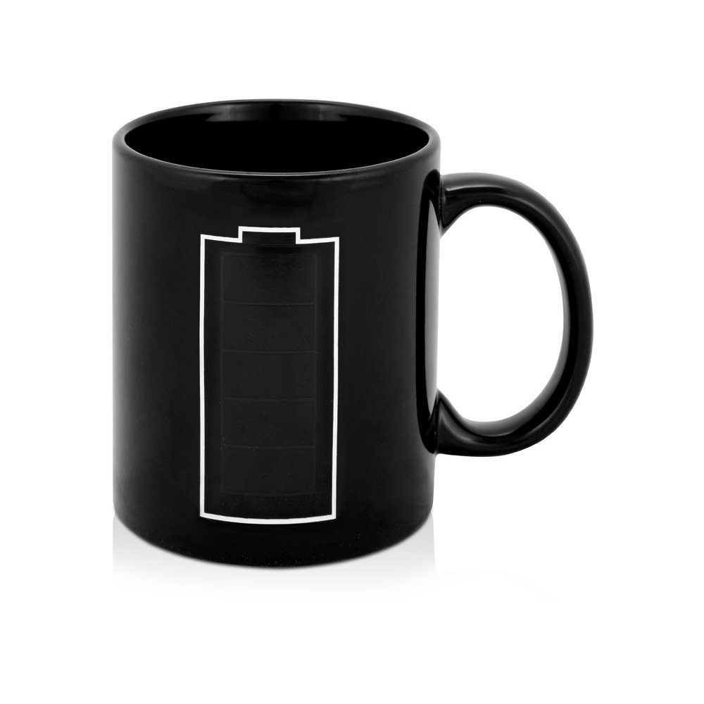 - Креативная керамическая кружка на 320 мл черного цвета имитирует индикатор заряда батареи. Просто налейте в нее горячий напиток и батарейка «зарядится». Замечательный подарок для любителей необычных вещей. * Кружку не рекомендуется мыть в посудомоечной машине, а так же пользоваться абразивными средствами при мытье.