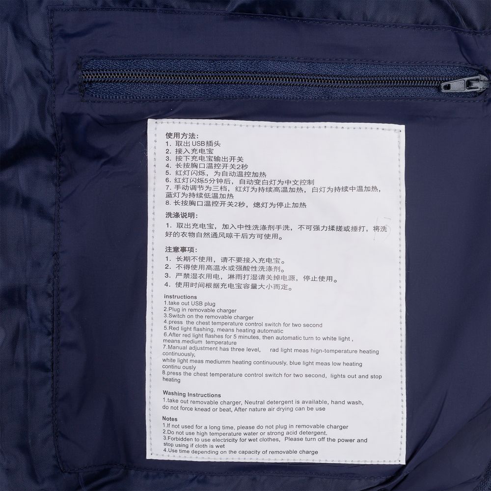 При использовании аккумулятора емкостью 10000 мАч нагревательный элемент будет работать от 6 до 12 часов в зависимости от выбранного режима работы и температуры окружающей среды.- Утепленная куртка на молнии со съемным капюшоном, 2 внешними карманами на молнии и 1 внутренним карманом