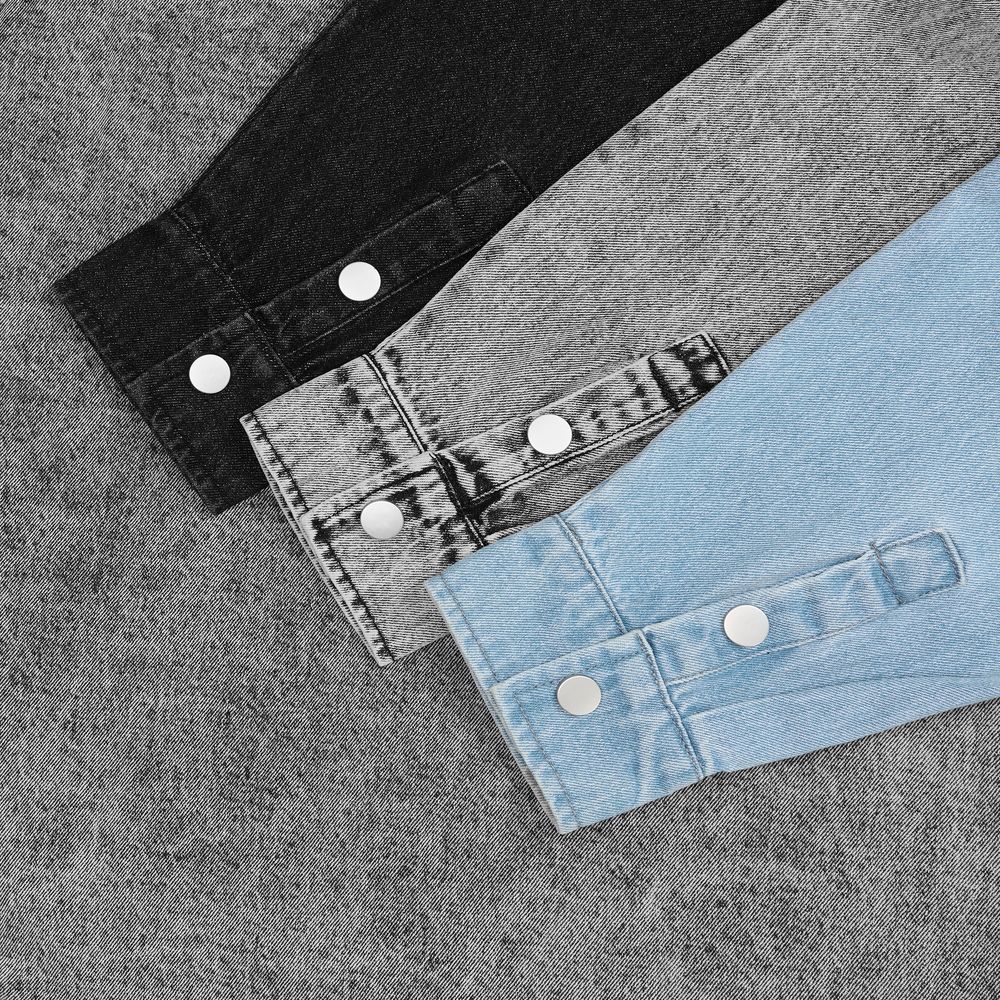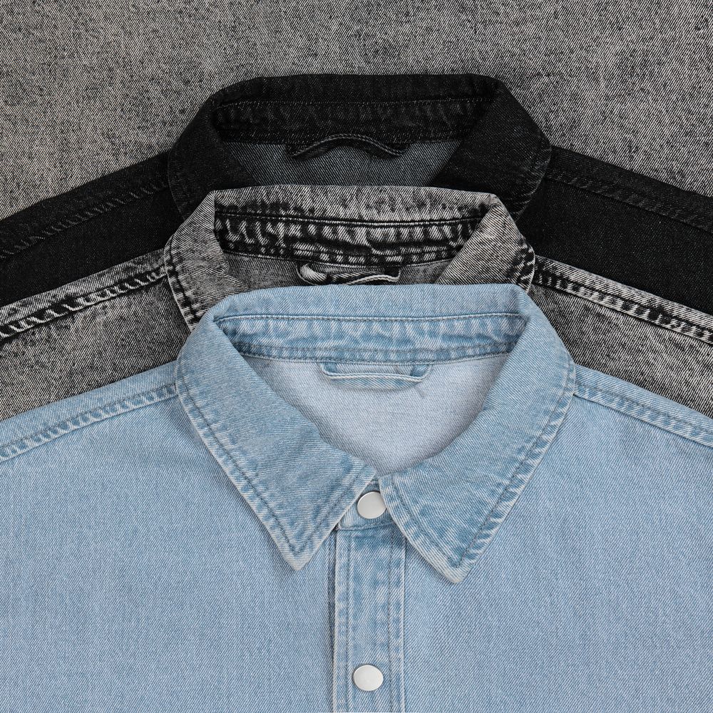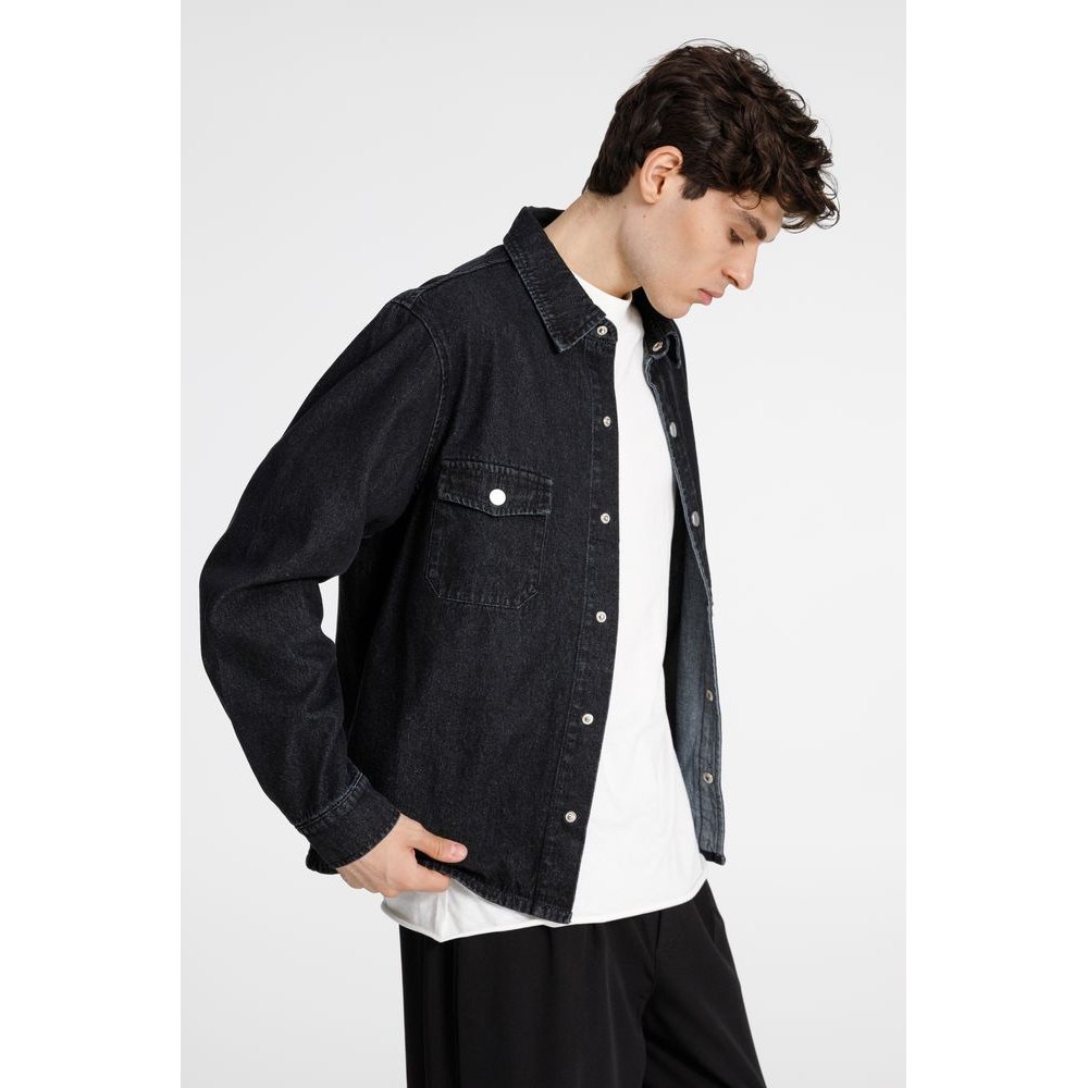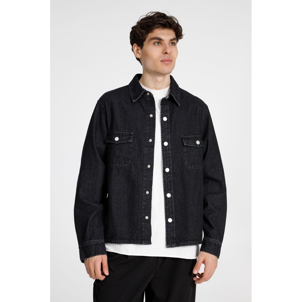 Джинсовая куртка-рубашка унисекс на кнопках прямого силуэта.- Два нагрудных кармана с клапанами
